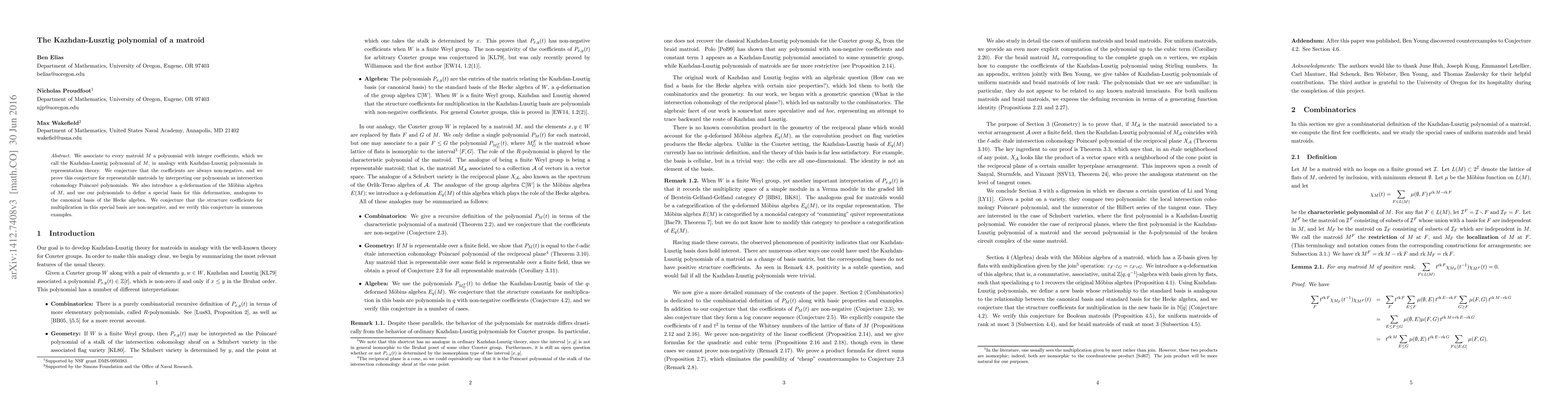 This paper introduces the Kazhdan-Lusztig polynomial for matroids, analogous to those in representation theory, proving non-negativity for representable matroids via intersection cohomology Poincaré polynomials. It also presents a q-deformation of the Möbius algebra and defines a special basis, verifying non-negativity of structure coefficients in many examples.