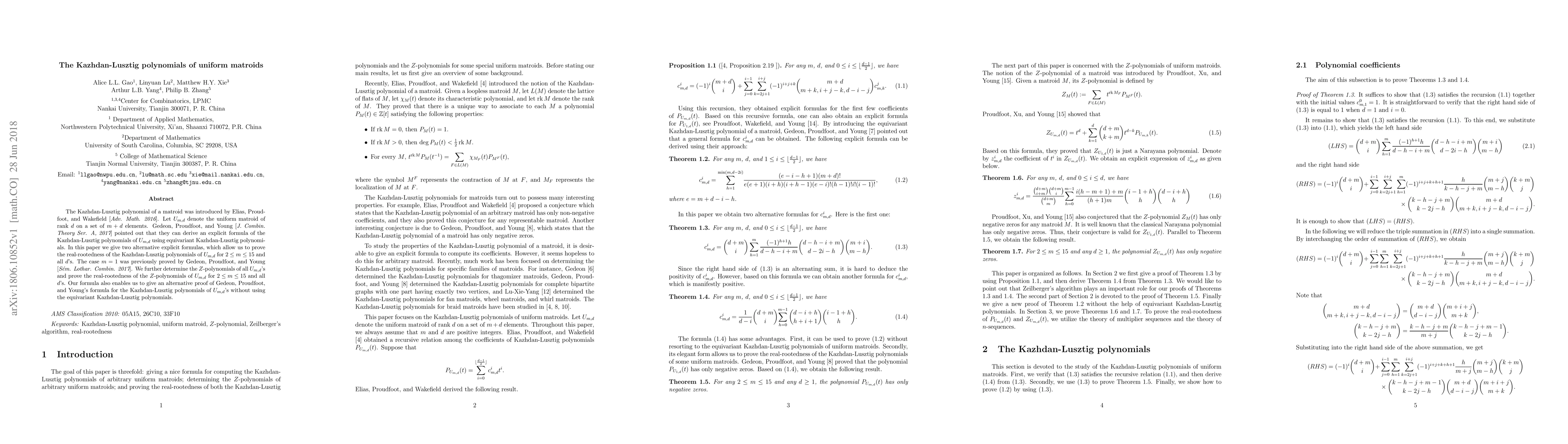 The Kazhdan-Lusztig polynomial of a matroid was introduced by Elias, Proudfoot, and Wakefield [{\it Adv. Math. 2016}]. Let $U_{m,d}$ denote the uniform matroid of rank $d$ on a set of $m+d$ elements. Gedeon, Proudfoot, and Young [{\it J. Combin. Theory Ser. A, 2017}] pointed out that they can derive an explicit formula of the Kazhdan-Lusztig polynomials of $U_{m,d}$ using equivariant Kazhdan-Lusztig polynomials. In this paper we give two alternative explicit formulas, which allow us to prove the real-rootedness of the Kazhdan-Lusztig polynomials of $U_{m,d}$ for $2\leq m\leq 15$ and all $d$'s. The case $m=1$ was previously proved by Gedeon, Proudfoot, and Young [{\it S\'{e}m. Lothar. Combin. 2017}]. We further determine the $Z$-polynomials of all $U_{m,d}$'s and prove the real-rootedness of the $Z$-polynomials of $U_{m,d}$ for $2\leq m\leq 15$ and all $d$'s. Our formula also enables us to give an alternative proof of Gedeon, Proudfoot, and Young's formula for the Kazhdan-Lusztig polynomials of $U_{m,d}$'s without using the equivariant Kazhdan-Lusztig polynomials.