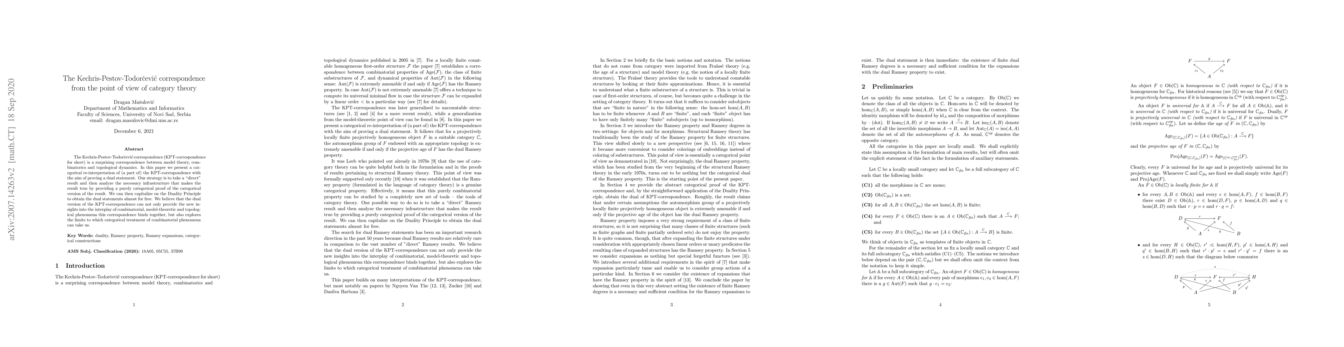 This paper reinterprets part of the Kechris-Pestov-Todorčević correspondence using category theory to prove dual statements, leveraging the Duality Principle for insights into the interplay of model theory, combinatorics, and topological dynamics. The categorical approach aims to explore the limits of combinatorial phenomena through a purely categorical lens.