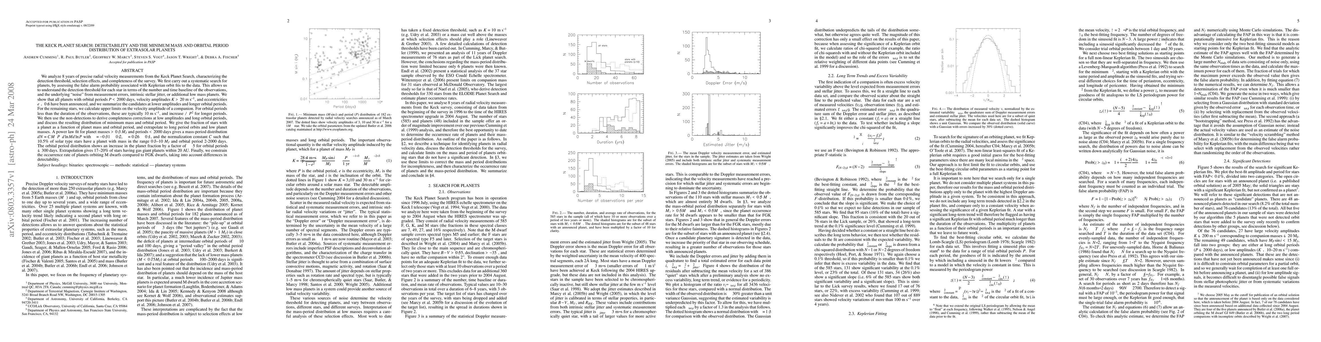 We analyze 8 years of precise radial velocity measurements from the Keck Planet Search, characterizing the detection threshold, selection effects, and completeness of the survey. We carry out a systematic search for planets by assessing the false alarm probability associated with Keplerian orbit fits to the data. This allows us to understand the detection threshold for each star in terms of the number and time baseline of the observations, and size of measurement errors and stellar jitter. We show that all planets with orbital periods <2000 days, velocity amplitudes >20 m/s, and eccentricities <0.6 have been announced, and summarize the candidates at lower amplitudes and longer orbital periods. For the remaining stars, we calculate upper limits on the velocity amplitude of a companion, typically 10 m/s, and use the non-detections to derive completeness corrections at low amplitudes and long orbital periods. We give the fraction of stars with a planet as a function of planet mass and orbital period, and extrapolate to long period orbits and low planet masses. A power law fit for planet masses >0.3 Jupiter masses and periods <2000 days gives a mass-period distribution dN=C M^\alpha P^\beta dlnM dlnP with \alpha=-0.31 \pm 0.2, \beta=0.26\pm 0.1, and the normalization constant C such that 10.5% of solar type stars have a planet with mass in the range 0.3-10 Jupiter masses and orbital period 2-2000 days. The orbital period distribution shows an increase in the planet fraction by a factor of 5 for orbital periods beyond 300 days. Extrapolation gives 17-20% of stars having gas giant planets within 20 AU. Finally, taking into account differences in detectability, we find that M dwarfs are 3 to 10 times less likely to harbor a Jupiter mass planet than solar type stars.