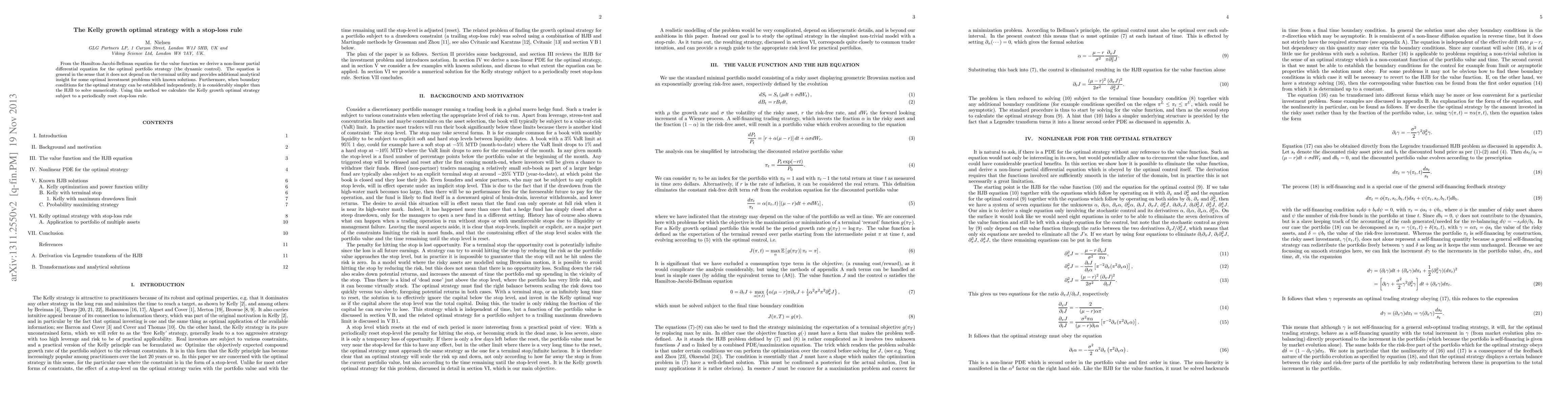This paper derives a non-linear partial differential equation for the optimal portfolio strategy from the Hamilton-Jacobi-Bellman equation, simplifying numerical solutions. It calculates the Kelly growth optimal strategy with a periodically reset stop-loss rule, providing analytical insights for optimal investment problems.