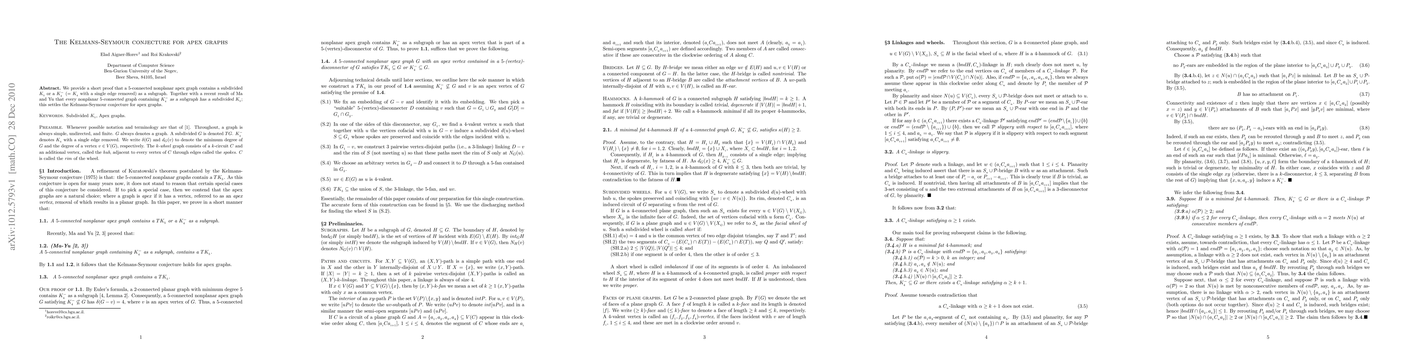 The paper proves that a 5-connected nonplanar apex graph contains either a subdivided $K_{5}$ or $K^{-4}$ subgraph, confirming the Kelmans-Seymour conjecture for apex graphs when combined with a related result by Ma and Yu.
