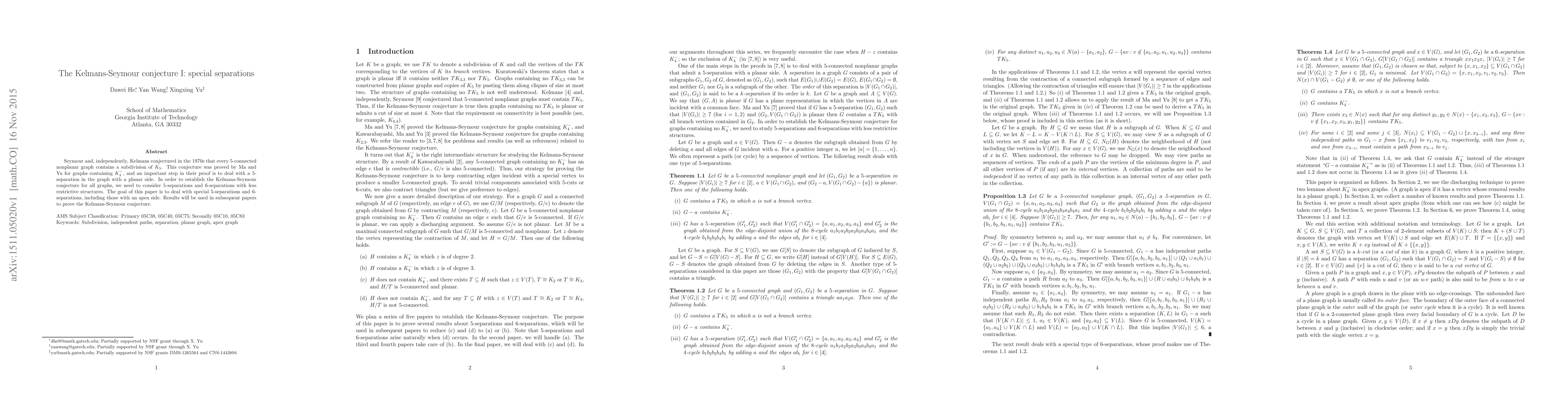 Seymour and, independently, Kelmans conjectured in the 1970s that every 5-connected nonplanar graph contains a subdivision of $K_5$. This conjecture was proved by Ma and Yu for graphs containing $K_4^-$, and an important step in their proof is to deal with a 5-separation in the graph with a planar side. In order to establish the Kelmans-Seymour conjecture for all graphs, we need to consider 5-separations and 6-separations with less restrictive structures. The goal of this paper is to deal with special 5-separations and 6-separations, including those with an apex side. Results will be used in subsequent papers to prove the Kelmans-Seymour conjecture.