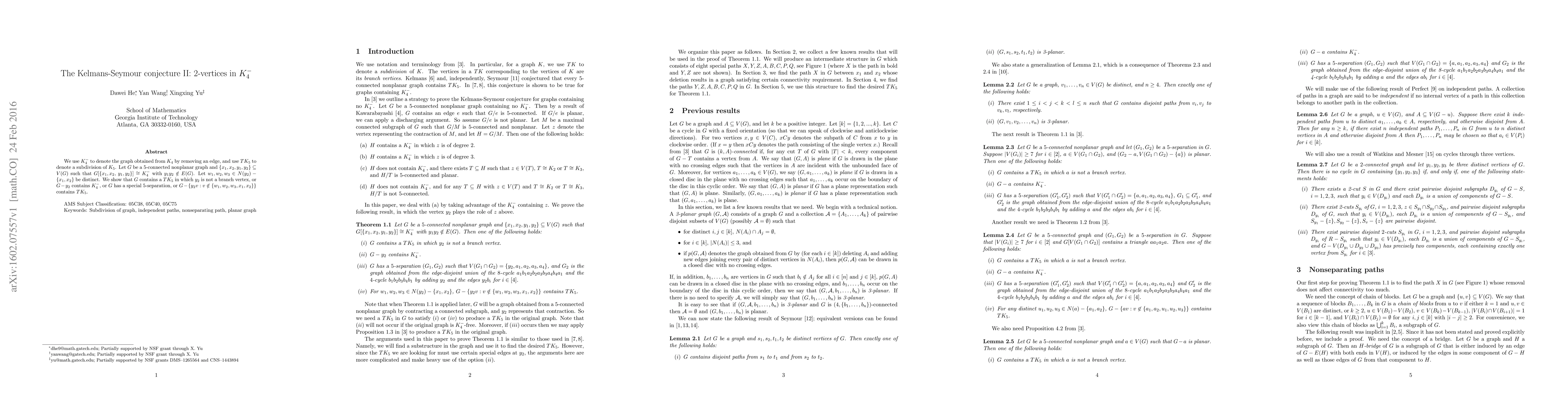 This paper investigates the Kelmans-Seymour conjecture for 5-connected nonplanar graphs containing a specific $K_4^-$ subgraph. It demonstrates that such graphs either contain a $TK_5$ subdivision, have a $K_4^-$ subgraph after removing $y_2$, exhibit a special 5-separation, or yield a $TK_5$ subdivision when certain vertices are removed.