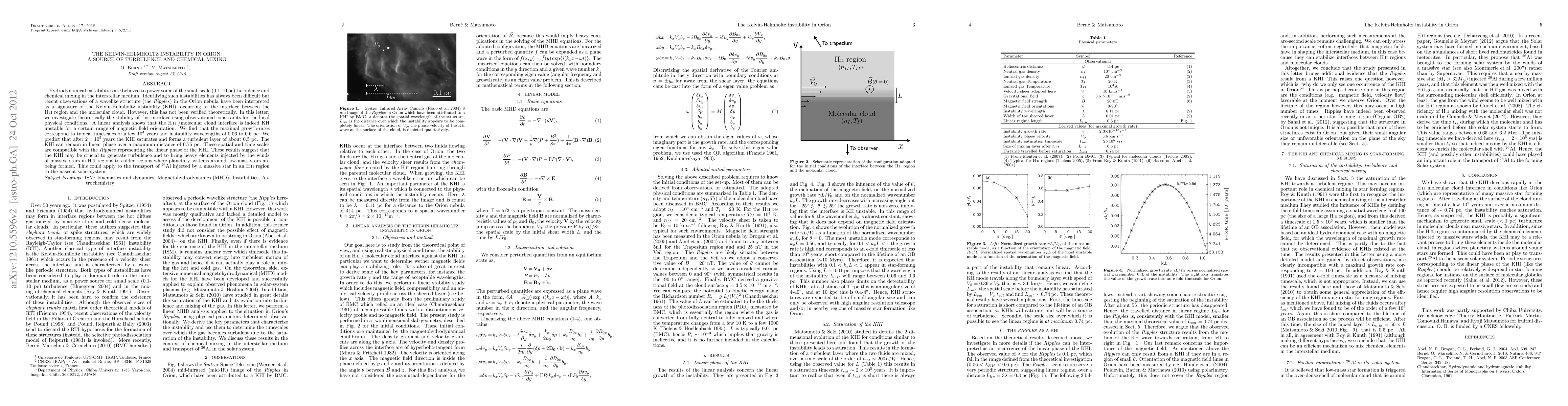 Hydrodynamical instabilities are believed to power some of the small scale (0.1-10 pc) turbulence and chemical mixing in the interstellar medium. Identifying such instabilities has always been difficult but recent observations of a wavelike structure (the Ripples) in the Orion nebula have been interpreted as a signature of the Kelvin-Helmholtz instability (KHI), occurring at the interface between the HII region and the molecular cloud. However, this has not been verified theoretically. In this letter, we investigate theoretically the stability of this interface using observational constraints for the local physical conditions. A linear analysis shows that the HII/molecular cloud interface is indeed KH unstable for a certain range of magnetic field orientation. We find that the maximal growth-rates correspond to typical timescales of a few 1e4 years and instability wavelengths of 0.06 to 0.6 pc. We predict that after 2e5 years the KHI saturates and forms a turbulent layer of thickness ~0.5 pc. The KHI can remain in linear phase over a maximum distance of 0.75 pc. These spatial and time scales are compatible with the Ripples representing the linear phase of the KHI. These results suggest that the KHI may be crucial to generate turbulence and to bring heavy elements injected by the winds of massive stars in HII regions to colder regions where planetary systems around low mass stars are being formed. This could apply to the transport of 26Al injected by a massive star in an HII region to the nascent solar-system.