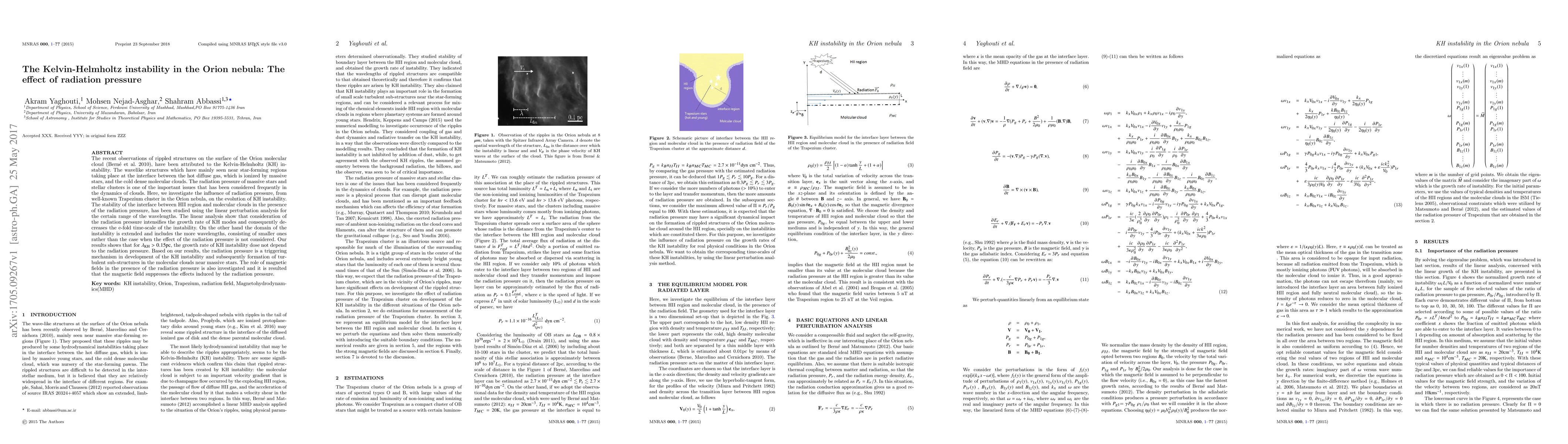 The recent observations of rippled structures on the surface of the Orion molecular cloud (Bern\'{e} et al. 2010), have been attributed to the Kelvin-Helmholtz (KH) instability. The wavelike structures which have mainly seen near star-forming regions taking place at the interface between the hot diffuse gas, which is ionized by massive stars, and the cold dense molecular clouds. The radiation pressure of massive stars and stellar clusters is one of the important issues that has been considered frequently in the dynamics of clouds. Here, we investigate the influence of radiation pressure, from well-known Trapezium cluster in the Orion nebula, on the evolution of KH instability. The stability of the interface between HII region and molecular clouds in the presence of the radiation pressure, has been studied using the linear perturbation analysis for the certain range of the wavelengths. The linear analysis show that consideration of the radiation pressure intensifies the growth rate of KH modes and consequently decreases the e-fold time-scale of the instability. On the other hand the domain of the instability is extended and includes the more wavelengths, consisting of smaller ones rather than the case when the effect of the radiation pressure is not considered. Our results shows that for $\lambda_{\rm KH}>0.15\rm pc$, the growth rate of KH instability dose not depend to the radiation pressure. Based on our results, the radiation pressure is a triggering mechanism in development of the KH instability and subsequently formation of turbulent sub-structures in the molecular clouds near massive stars. The role of magnetic fields in the presence of the radiation pressure is also investigated and it is resulted that the magnetic field suppresses the effects induced by the radiation pressure.