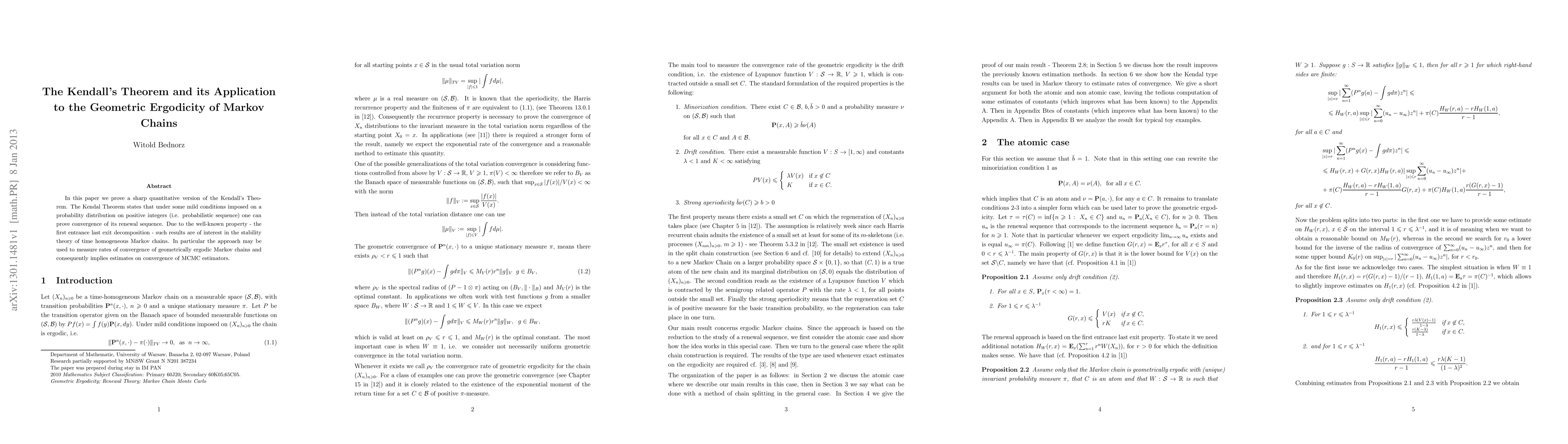This paper proves a refined quantitative version of Kendall's Theorem, which ensures the convergence of renewal sequences under mild conditions. The theorem's application extends to assessing the geometric ergodicity of time homogeneous Markov chains and estimating the convergence rates of MCMC estimators.