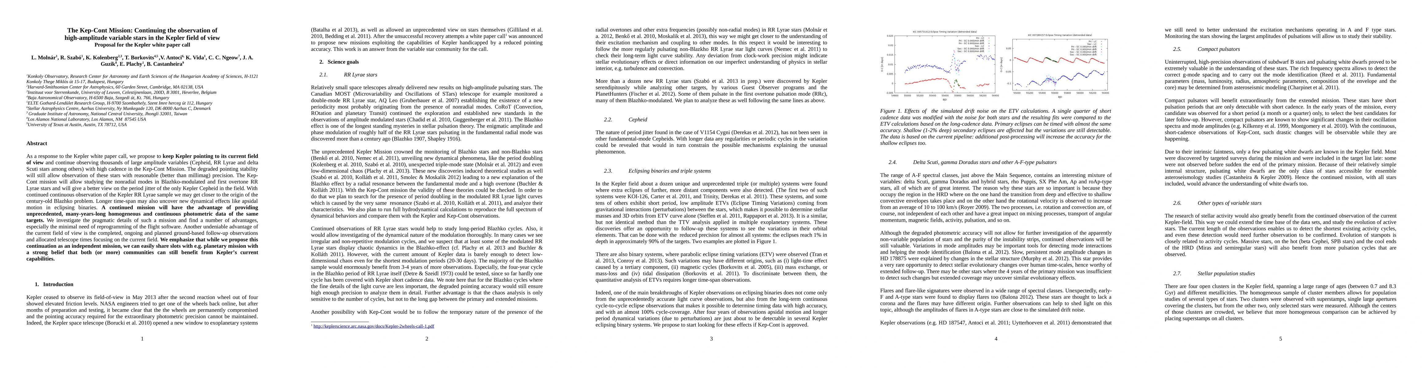 The Kep-Cont Mission proposes to continue observing high-amplitude variable stars in the Kepler field with high-cadence data, aiming to study nonradial modes in Blazhko-modulated stars and period jitter in Cepheids. The mission would provide long-term, homogeneous photometric data, benefiting both stellar and planetary research communities.