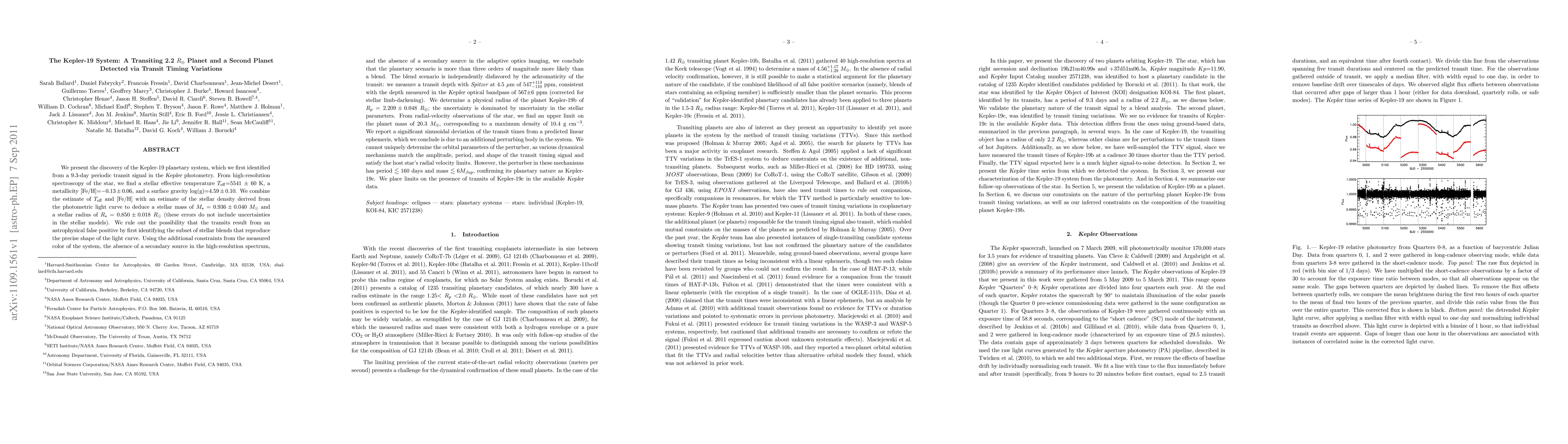 We present the discovery of the Kepler-19 planetary system, which we first identified from a 9.3-day periodic transit signal in the Kepler photometry. From high-resolution spectroscopy of the star, we find a stellar effective temperature Teff=5541 \pm 60 K, a metallicity [Fe/H]=-0.13 \pm 0.06, and a surface gravity log(g)=4.59 \pm 0.10. We combine the estimate of Teff and [Fe/H] with an estimate of the stellar density derived from the photometric light curve to deduce a stellar mass of M_star = 0.936 \pm 0.040 M_Sun and a stellar radius of R_star = 0.850 \pm 0.018 R_Sun. We rule out the possibility that the transits result from an astrophysical false positive by first identifying the subset of stellar blends that reproduce the precise shape of the light curve. We conclude that the planetary scenario is more than three orders of magnitude more likely than a blend. The blend scenario is independently disfavored by the achromaticity of the transit: we measure a transit depth with Spitzer at 4.5 {\mu}m of 547+113-110 ppm, consistent with the depth measured in the Kepler optical bandpass of 567\pm6 ppm. We determine a physical radius of the planet Kepler-19b of R_p = 2.209 \pm 0.048 R_Earth. From radial-velocity observations of the star, we find an upper limit on the planet mass of 20.3 M_Earth, corresponding to a maximum density of 10.4 g cm^-3. We report a significant sinusoidal deviation of the transit times from a predicted linear ephemeris, which we conclude is due to an additional perturbing body in the system. We cannot uniquely determine the orbital parameters of the perturber, as various dynamical mechanisms match the amplitude, period, and shape of the transit timing signal and satisfy the host star's radial velocity limits. However, the perturber in these mechanisms has period <160 days and mass <6 M_Jup, confirming its planetary nature as Kepler-19c. [Abridged]