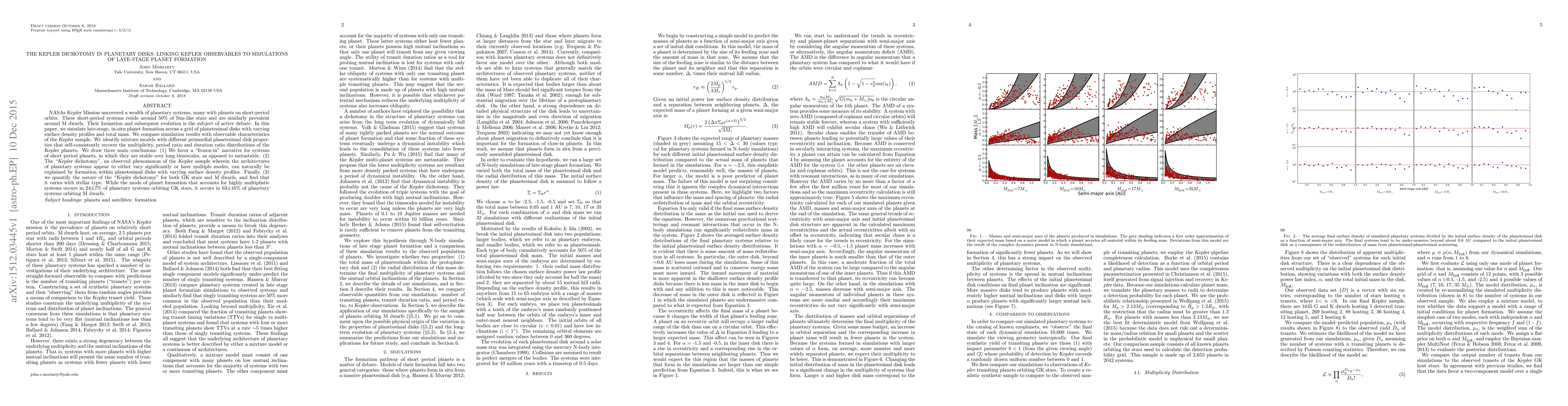 NASA's Kepler Mission uncovered a wealth of planetary systems, many with planets on short-period orbits. These short-period systems reside around 50% of Sun-like stars and are similarly prevalent around M dwarfs. Their formation and subsequent evolution is the subject of active debate. In this paper, we simulate late-stage, in-situ planet formation across a grid of planetesimal disks with varying surface density profiles and total mass. We compare simulation results with observable characteristics of the Kepler sample. We identify mixture models with different primordial planetesimal disk properties that self-consistently recover the multiplicity, period ratio and duration ratio distributions of the Kepler planets. We draw three main conclusions: (1) We favor a "frozen-in" narrative for systems of short period planets, in which they are stable over long timescales, as opposed to metastable. (2) The "Kepler dichotomy", an observed phenomenon of the Kepler sample wherein the architectures of planetary systems appear to either vary significantly or have multiple modes, can naturally be explained by formation within planetesimal disks with varying surface density profiles. Finally, (3) we quantify the nature of the "Kepler dichotomy" for both GK stars and M dwarfs, and find that it varies with stellar type. While the mode of planet formation that accounts for highly multiplistic systems occurs in 24+/-7% of planetary systems orbiting GK stars, it occurs in 63+/-16% of planetary systems orbiting M dwarfs.