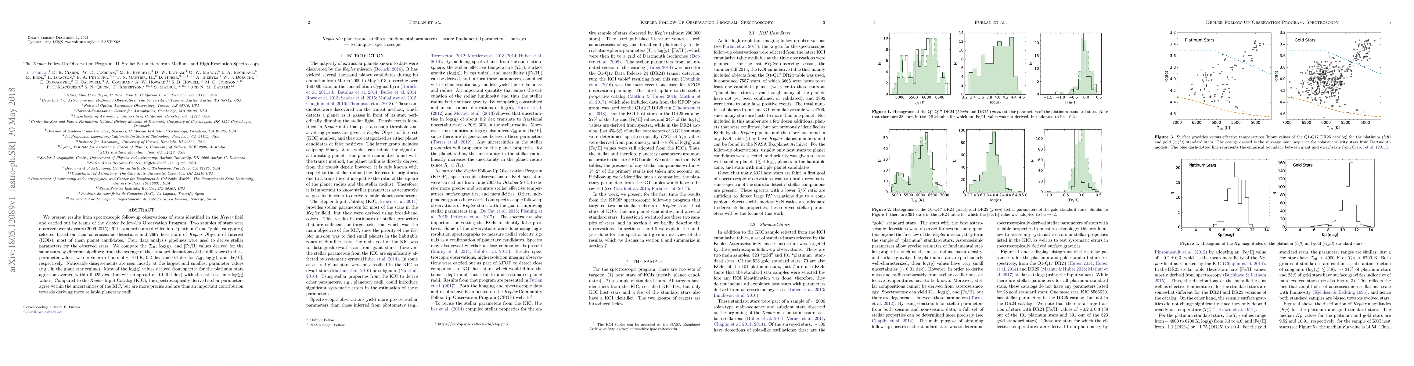 This research presents stellar parameters derived from spectroscopic follow-up observations of stars in the Kepler field, using data from four different telescopes and analysis pipelines (SPC, Kea, SpecMatch, Newspec). The study focuses on two sets of standard stars ('platinum' and 'gold') and 2667 KOI host stars.