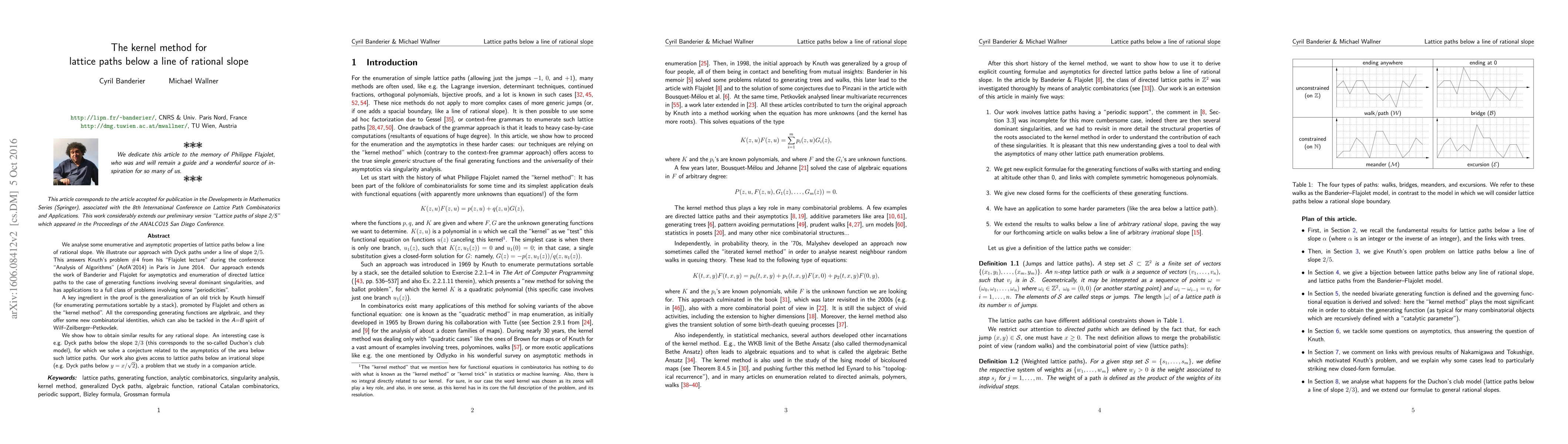 We analyse some enumerative and asymptotic properties of lattice paths below a line of rational slope. We illustrate our approach with Dyck paths under a line of slope $2/5$. This answers Knuth's problem #4 from his "Flajolet lecture" during the conference "Analysis of Algorithms" (AofA'2014) in Paris in June 2014. Our approach extends the work of Banderier and Flajolet for asymptotics and enumeration of directed lattice paths to the case of generating functions involving several dominant singularities, and has applications to a full class of problems involving some "periodicities". A key ingredient in the proof is the generalization of an old trick by Knuth himself (for enumerating permutations sortable by a stack), promoted by Flajolet and others as the "kernel method". All the corresponding generating functions are algebraic, and they offer some new combinatorial identities, which can also be tackled in the A=B spirit of Wilf-Zeilberger-Petkovsek. We show how to obtain similar results for any rational slope. An interesting case is e.g. Dyck paths below the slope $2/3$ (this corresponds to the so-called Duchon's club model), for which we solve a conjecture related to the asymptotics of the area below such lattice paths. Our work also gives access to lattice paths below an irrational slope (e.g. Dyck paths below $y=x/\sqrt{2}$), a problem that we study in a companion article.