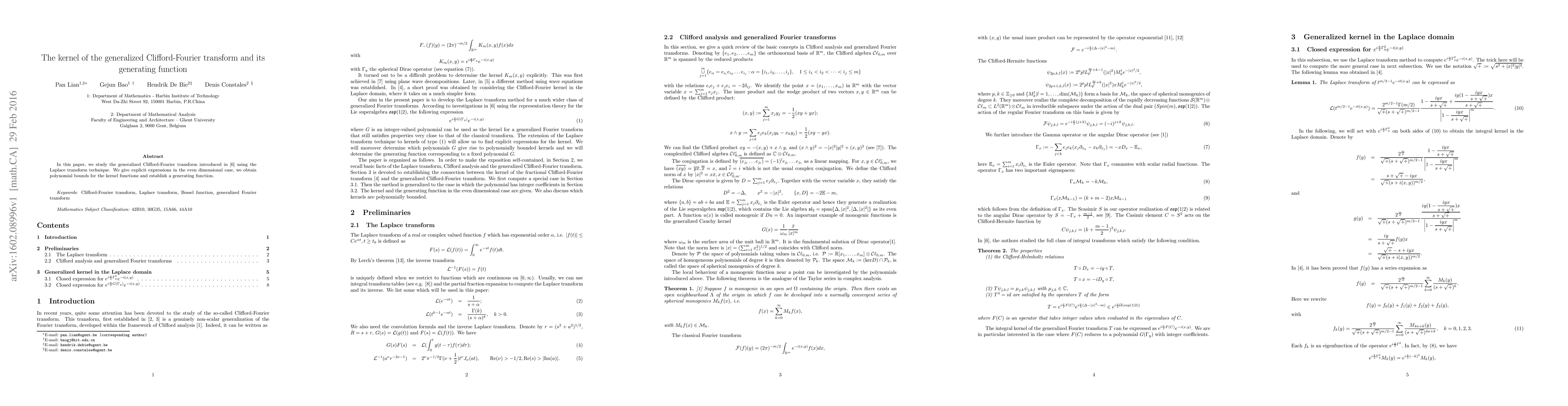 This paper investigates the generalized Clifford-Fourier transform using Laplace transform techniques, providing explicit expressions and polynomial bounds for the kernel functions in even dimensions, and establishing a generating function.
