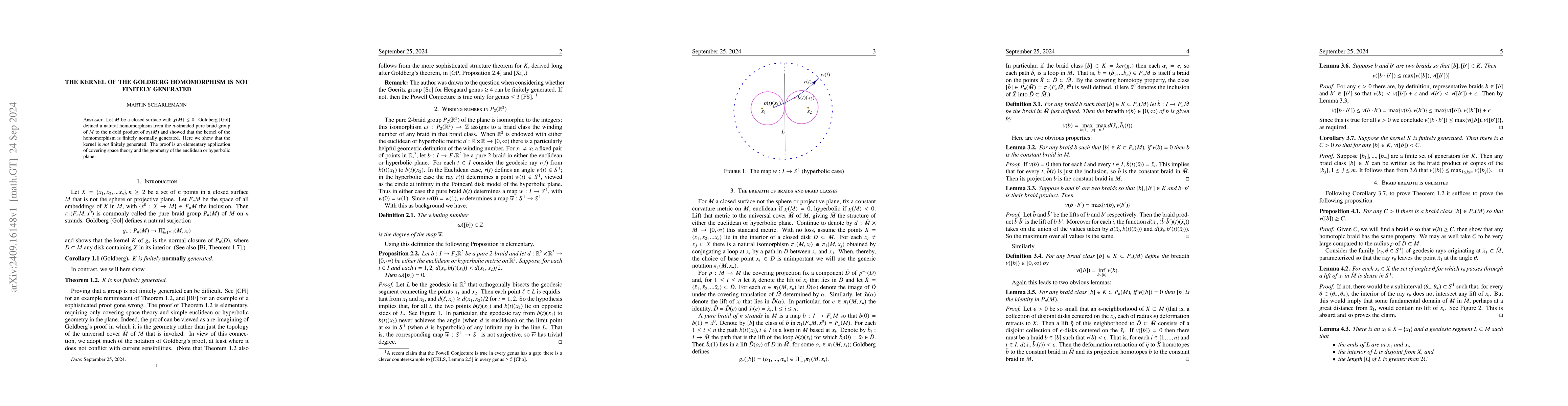 This paper demonstrates that the kernel of Goldberg's homomorphism from the n-stranded pure braid group of a closed surface (other than the sphere or projective plane) to the n-fold product of the fundamental group is not finitely generated, despite being finitely normally generated. The proof utilizes covering space theory and geometric properties of Euclidean or hyperbolic planes.
