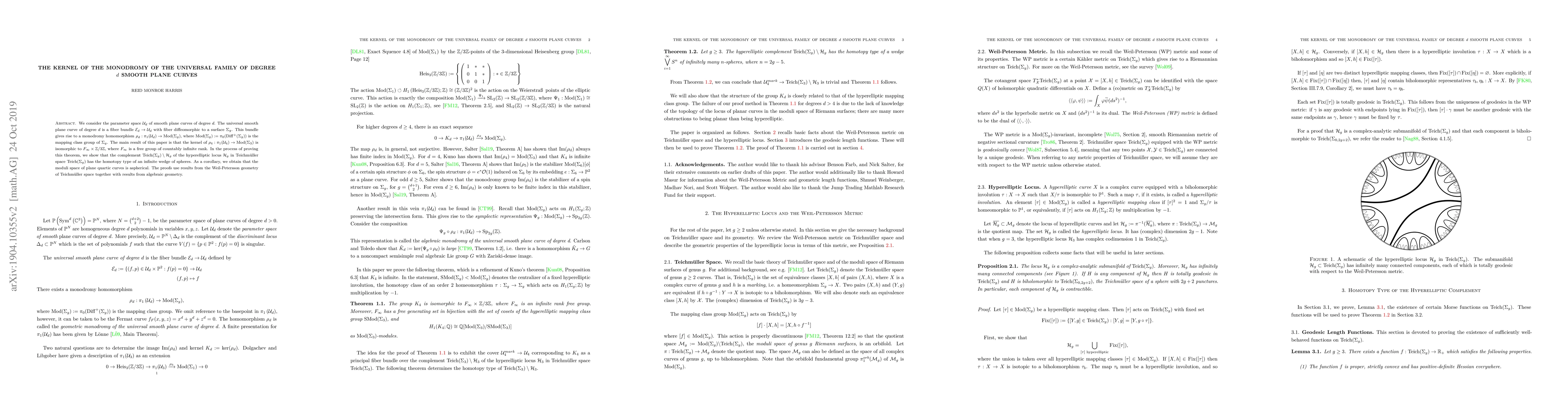 We consider the parameter space $\mathcal U_d$ of smooth plane curves of degree $d$. The universal smooth plane curve of degree $d$ is a fiber bundle $\mathcal E_d\to\mathcal U_d$ with fiber diffeomorphic to a surface $\Sigma_g$. This bundle gives rise to a monodromy homomorphism $\rho_d:\pi_1(\mathcal U_d)\to\mathrm{Mod}(\Sigma_g)$, where $\mathrm{Mod}(\Sigma_g):=\pi_0(\mathrm{Diff}^+(\Sigma_g))$ is the mapping class group of $\Sigma_g$. The main result of this paper is that the kernel of $\rho_4:\pi_1(\mathcal U_4)\to\mathrm{Mod}(\Sigma_3)$ is isomorphic to $F_\infty\times\mathbb{Z}/3\mathbb{Z}$, where $F_\infty$ is a free group of countably infinite rank. In the process of proving this theorem, we show that the complement $\mathrm{Teich}(\Sigma_g)\setminus\mathcal{H}_g$ of the hyperelliptic locus $\mathcal{H}_g$ in Teichm\"uller space $\mathrm{Teich}(\Sigma_g)$ has the homotopy type of an infinite wedge of spheres. As a corollary, we obtain that the moduli space of plane quartic curves is aspherical. The proofs use results from the Weil-Petersson geometry of Teichm\"uller space together with results from algebraic geometry.