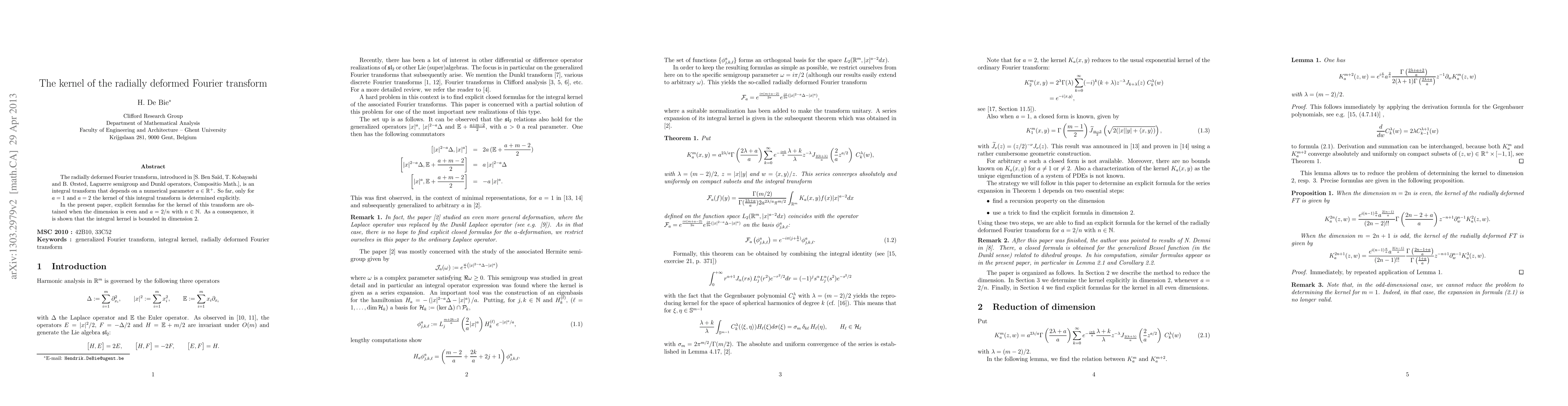 This paper derives explicit formulas for the kernel of the radially deformed Fourier transform when the dimension is even and the parameter $a = 2/n$ with $n \in N$. It also demonstrates that the integral kernel is bounded in dimension 2.