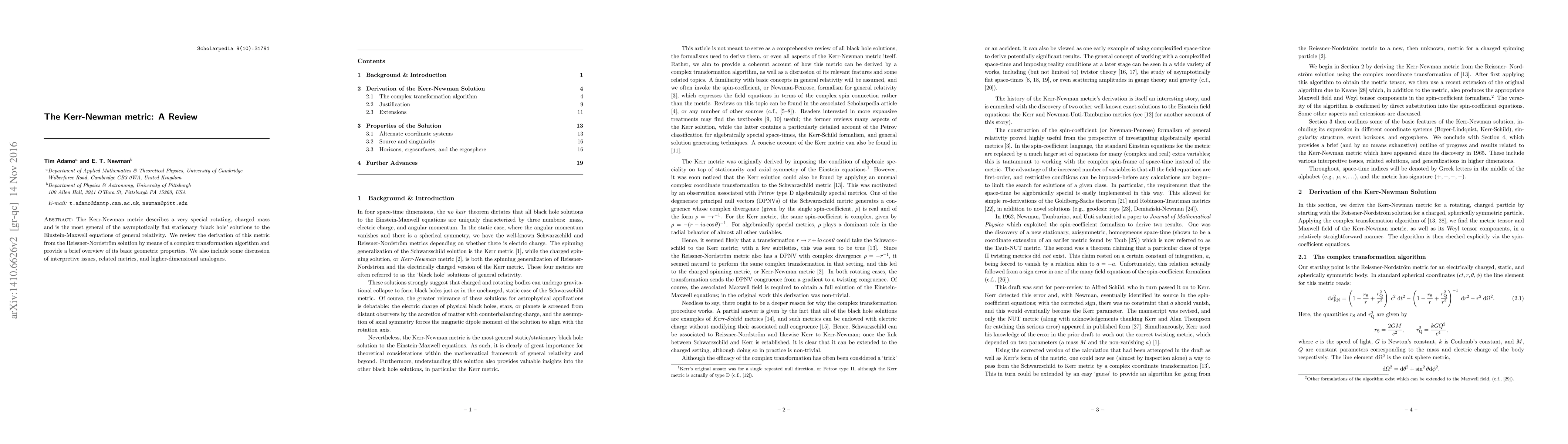 The Kerr-Newman metric is a comprehensive solution to the Einstein-Maxwell equations describing rotating, charged black holes. This review covers its derivation from the Reissner-Nordström solution and highlights its geometric and interpretive aspects, alongside related metrics and higher-dimensional extensions.