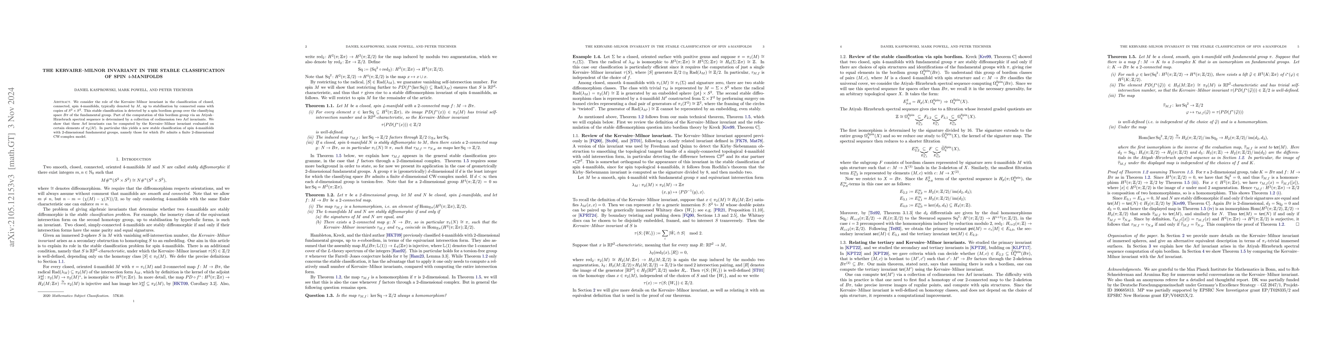 Summary: The paper investigates the Kervaire-Milnor invariant's role in classifying spin 4-manifolds up to stabilization via connected sums with $S^2 \times S^2$. It demonstrates that the Arf invariants in the computation of spin bordism groups can be derived from the Kervaire-Milnor invariant, leading to a new stable classification for spin 4-manifolds with 2-dimensional fundamental groups.