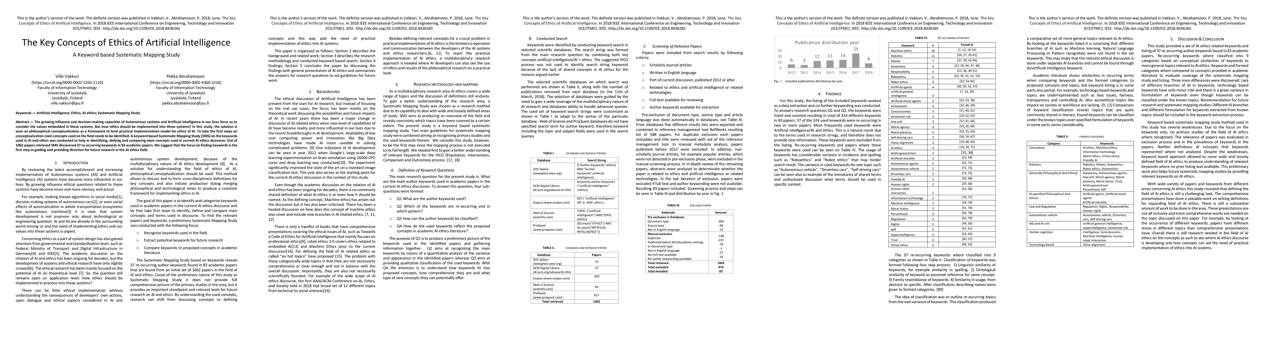 The growing influence and decision-making capacities of Autonomous systems and Artificial Intelligence in our lives force us to consider the values embedded in these systems. But how ethics should be implemented into these systems? In this study, the solution is seen on philosophical conceptualization as a framework to form practical implementation model for ethics of AI. To take the first steps on conceptualization main concepts used on the field needs to be identified. A keyword based Systematic Mapping Study (SMS) on the keywords used in AI and ethics was conducted to help in identifying, defying and comparing main concepts used in current AI ethics discourse. Out of 1062 papers retrieved SMS discovered 37 re-occurring keywords in 83 academic papers. We suggest that the focus on finding keywords is the first step in guiding and providing direction for future research in the AI ethics field.
