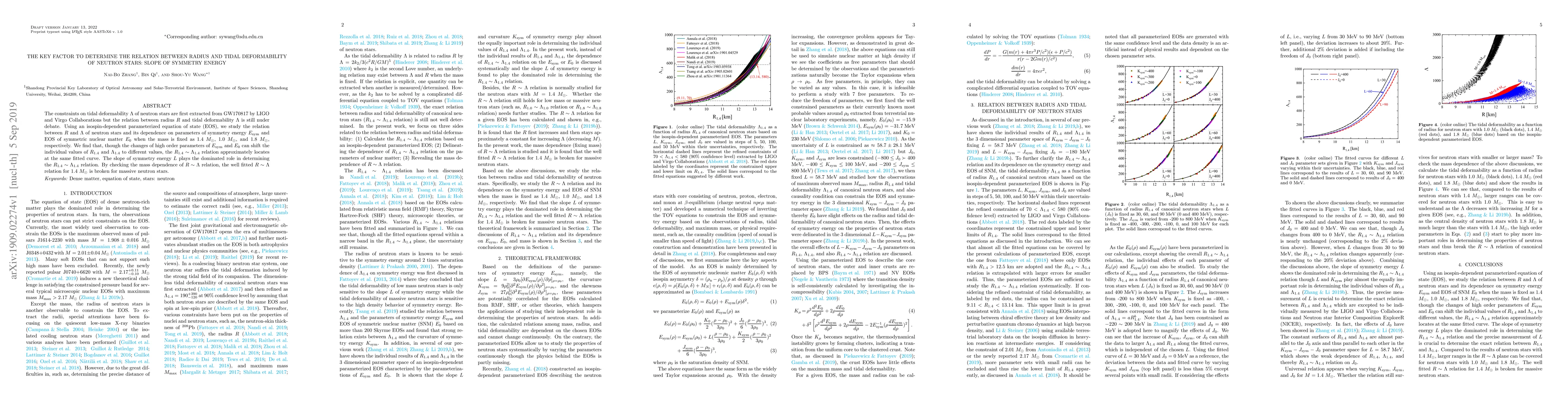 This paper investigates the relationship between neutron star radius ($R$) and tidal deformability ($\Lambda$), finding that the slope of symmetry energy ($L$) is the key factor determining this relation. The study reveals that while various parameters affect individual values of $R$ and $\Lambda$, the $R \sim \Lambda$ relation remains consistent for a fixed mass of $1.4 M_\odot$, but breaks down for more massive neutron stars.