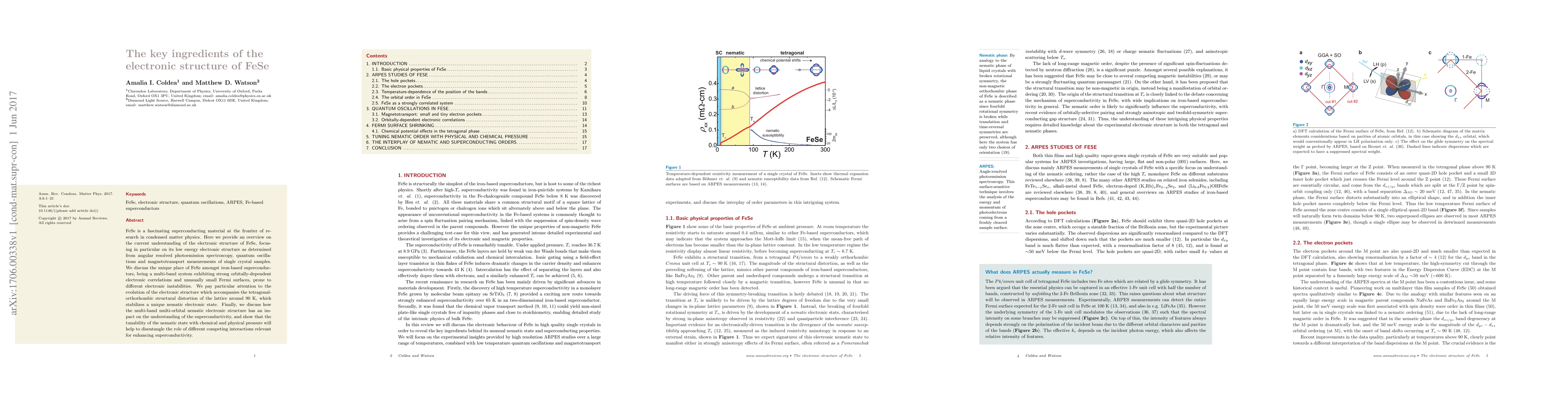 This paper reviews FeSe's electronic structure, highlighting its multi-band nature, small Fermi surfaces, and orbital correlations, with a focus on its nematic state induced by lattice distortion. It discusses how the electronic structure influences superconductivity and the potential of external pressures to clarify competing interactions.
