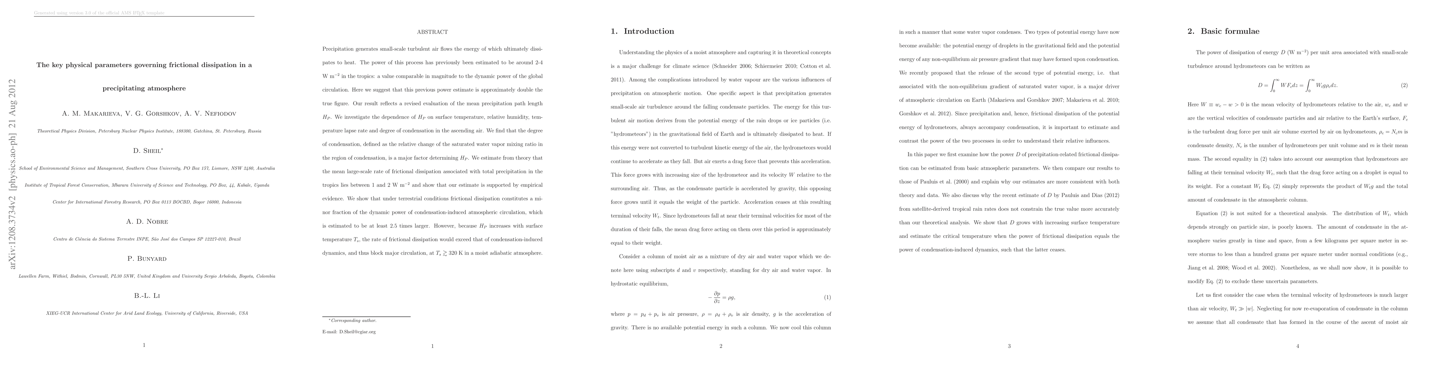 Precipitation generates small-scale turbulent air flows the energy of which ultimately dissipates to heat. The power of this process has previously been estimated to be around 2-4 W m-2 in the tropics: a value comparable in magnitude to the dynamic power of the global circulation. Here we suggest that this previous power estimate is approximately double the true figure. Our result reflects a revised evaluation of the mean precipitation path length Hp. We investigate the dependence of Hp on surface temperature,relative humidity,temperature lapse rate and degree of condensation in the ascending air. We find that the degree of condensation,defined as the relative change of the saturated water vapor mixing ratio in the region of condensation, is a major factor determining Hp. We estimate from theory that the mean large-scale rate of frictional dissipation associated with total precipitation in the tropics lies between 1 and 2 W m-2 and show that our estimate is supported by empirical evidence. We show that under terrestrial conditions frictional dissipation constitutes a minor fraction of the dynamic power of condensation-induced atmospheric circulation,which is estimated to be at least 2.5 times larger. However,because Hp increases with surface temperature Ts, the rate of frictional dissipation would exceed that of condensation-induced dynamics, and thus block major circulation, at Ts >~320 K in a moist adiabatic atmosphere.