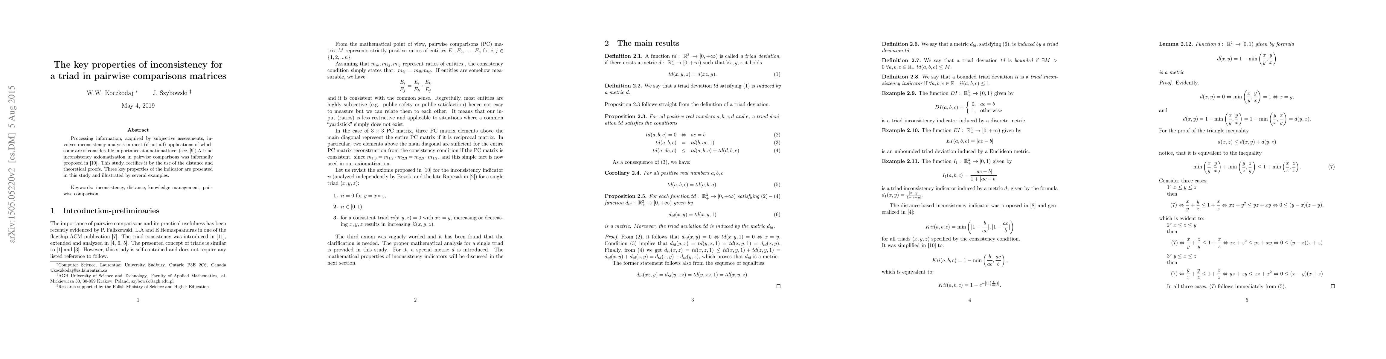 Processing information, acquired by subjective assessments, involves inconsistency analysis in most (if not all) applications of which some are of considerable importance at a national level (see, Koczkodaj/Kulakowski/Ligenza, Scientometrics, 99(3): 911-926, 2014)A triad inconsistency axiomatization in pairwise comparisons was informally proposed in Koczkodaj/Szwarc, FUNDAMENTA INFORMATICAE, 132(4): 485-500, 2014. This study, rectifies it by the use of the distance and theoretical proofs. Three key properties of the indicator are presented in this study and illustrated by several examples.