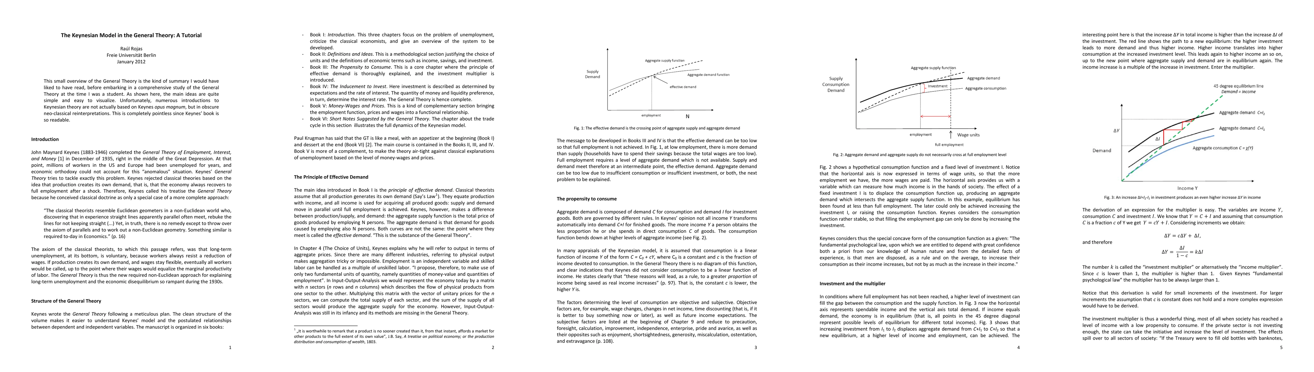 This small overview of the General Theory is the kind of summary I would have liked to have read, before embarking in a comprehensive study of the General Theory at the time I was a student. As shown here, the main ideas are quite simple and easy to visualize. Unfortunately, numerous introductions to Keynesian theory are not actually based on Keynes opus magnum, but in obscure neoclassical reinterpretations. This is completely pointless since Keynes' book is so readable.