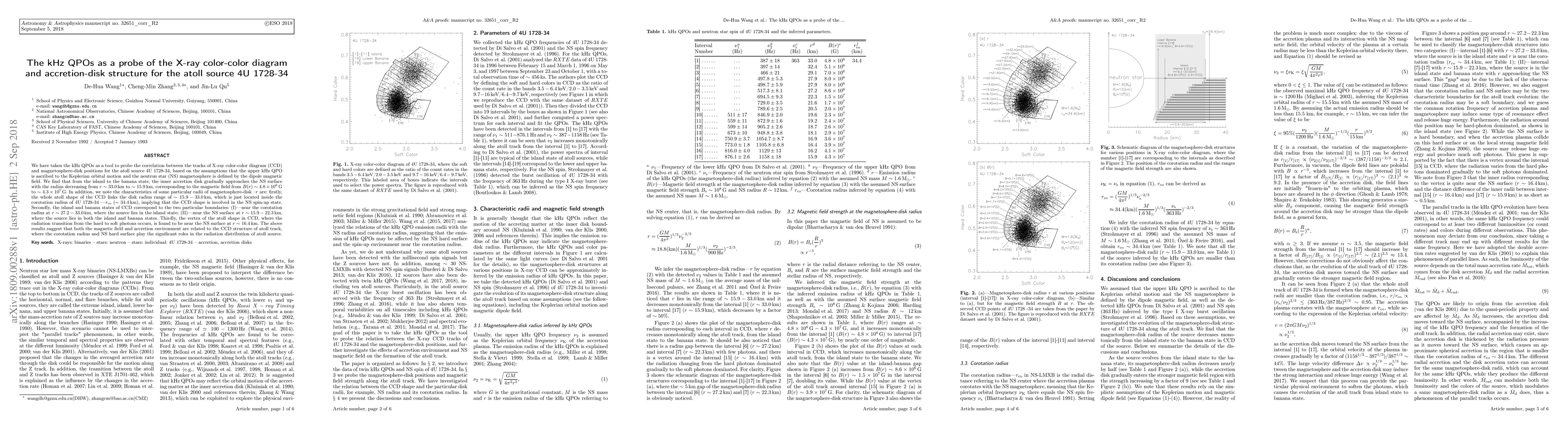 We have taken the kHz QPOs as a tool to probe the correlation between the tracks of X-ray color-color diagram (CCD) and magnetosphere-disk positions for the atoll source 4U 1728-34, based on the assumptions that the upper kHz QPO is ascribed to the Keplerian orbital motion and the neutron star (NS) magnetosphere is defined by the dipole magnetic field. We find that from the island to the banana state, the inner accretion disk gradually approaches the NS surface with the radius decreasing from r ~33.0km to ~15.9 km, corresponding to the magnetic field from B(r) ~4.8*10^6 G to ~4.3*10^7 G. In addition, we note the characteristics of some particular radii of magnetosphere-disk -r are: firstly, the whole atoll shape of the CCD links the disk radius range of ~15.9 - 33.0 km, which is just located inside the corotation radius of 4U 1728-34 -r_co ( ~34.4 km), implying that the CCD shape is involved in the NS spin-up state. Secondly, the island and banana states of CCD correspond to the two particular boundaries: (I)-near the corotation radius at r ~27.2 - 33.0 km, where the source lies in the island state; (II)-near the NS surface at r ~15.9 - 22.3 km, where the source lies in both the island and banana states. Thirdly, the vertex of the atoll shape in CCD, where the radiation transition from the hard to soft photons occurs, is found to be near the NS surface at r ~16.4 km. The above results suggest that both the magnetic field and accretion environment are related to the CCD structure of atoll track, where the corotation radius and NS hard surface play the significant roles in the radiation distribution of atoll source.