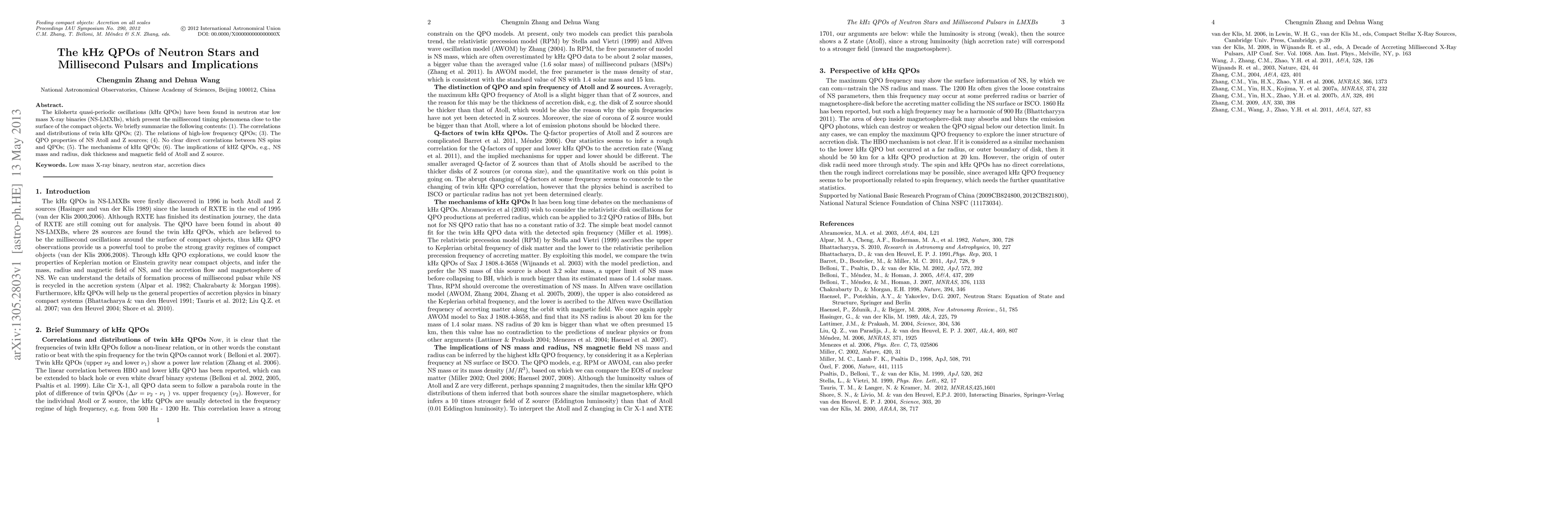 The kilohertz quasi-periodic oscillations (kHz QPOs) have been found in neutron star low mass X-ray binaries (NS-LMXBs), which present the millisecond timing phenomena close to the surface of the compact objects. We briefly summarize the following contents: (1). The correlations and distributions of twin kHz QPOs; (2). The relations of high-low frequency QPOs; (3). The QPO properties of NS Atoll and Z sources; (4). No clear direct correlations between NS spins and QPOs; (5). The mechanisms of kHz QPOs; (6). The implications of kHZ QPOs, e.g., NS mass and radius, disk thickness and magnetic field of Atoll and Z source.