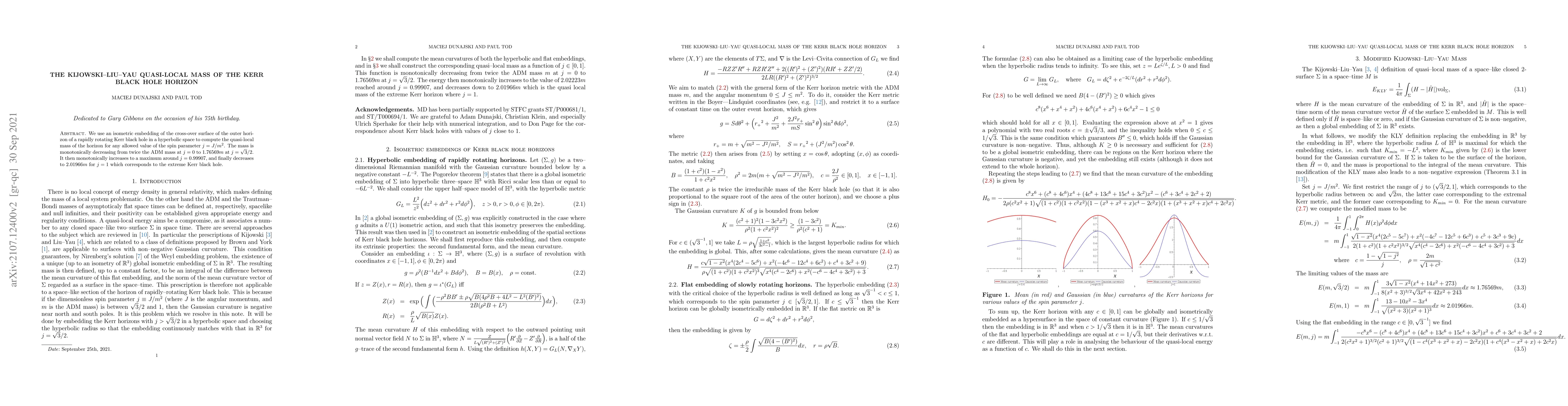 We use the isometric embedding of the spatial horizon of fast rotating Kerr black hole in a hyperbolic space to compute the quasi-local mass of the horizon for any value of the spin parameter $j=J/m^2$. The mass is monotonically decreasing from twice the ADM mass at $j=0$ to $1.76569m$ at $j=\sqrt{3}/2$. It then monotonicaly increases to a maximum around $j=0.99907$, and finally decreases to $2.01966m$ for $j=1$ which corresponds to the extreme Kerr black hole.