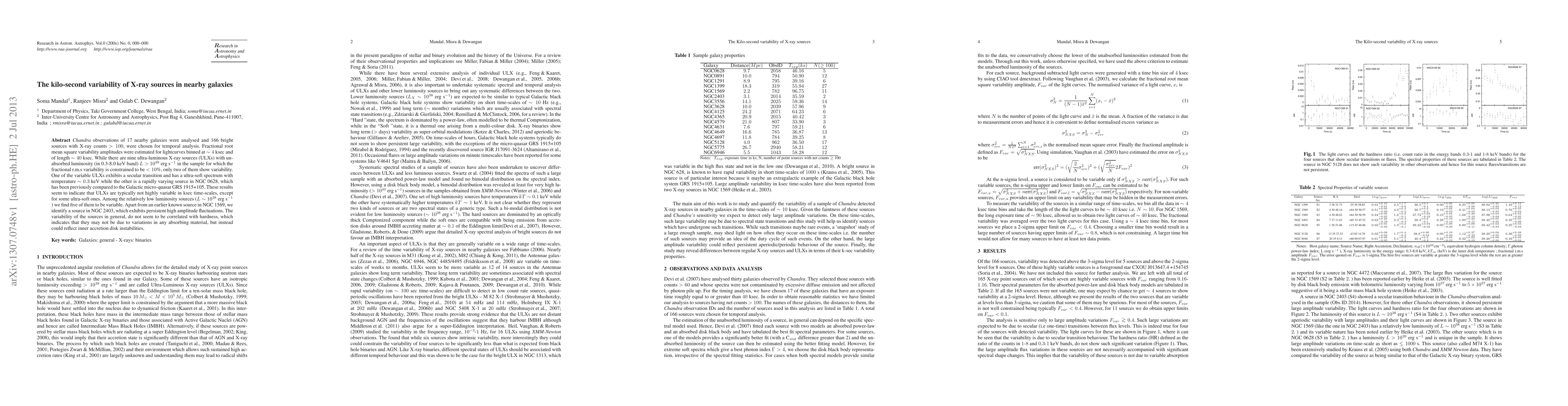 This study analyzes the kilo-second variability of X-ray sources in 17 nearby galaxies using Chandra observations, revealing that most ultra-luminous X-ray sources (ULXs) are not highly variable. Only a few low-luminosity sources and some ultra-soft ULXs exhibit variability, suggesting inner accretion disk instabilities may drive the observed fluctuations.