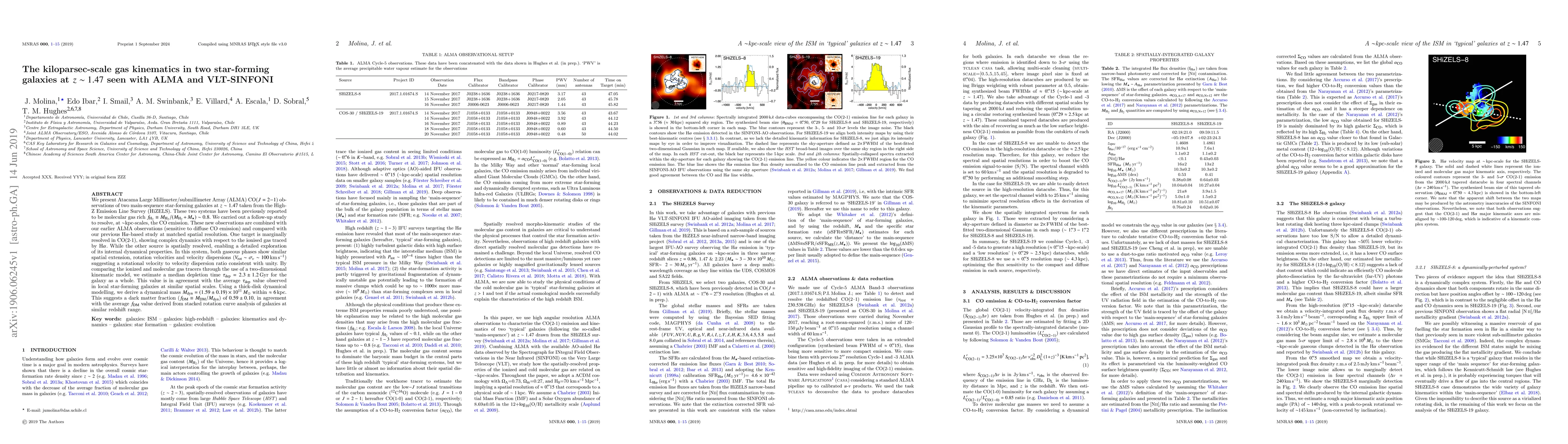 This paper uses ALMA and VLT-SINFONI to study the gas kinematics in two star-forming galaxies at $z\sim1.47$, revealing complex dynamics and similar spatial extensions for both ionized and molecular gas phases. The analysis suggests a median depletion time of 2.3 Gyr and a dark matter fraction of 0.59, consistent with local galaxies.