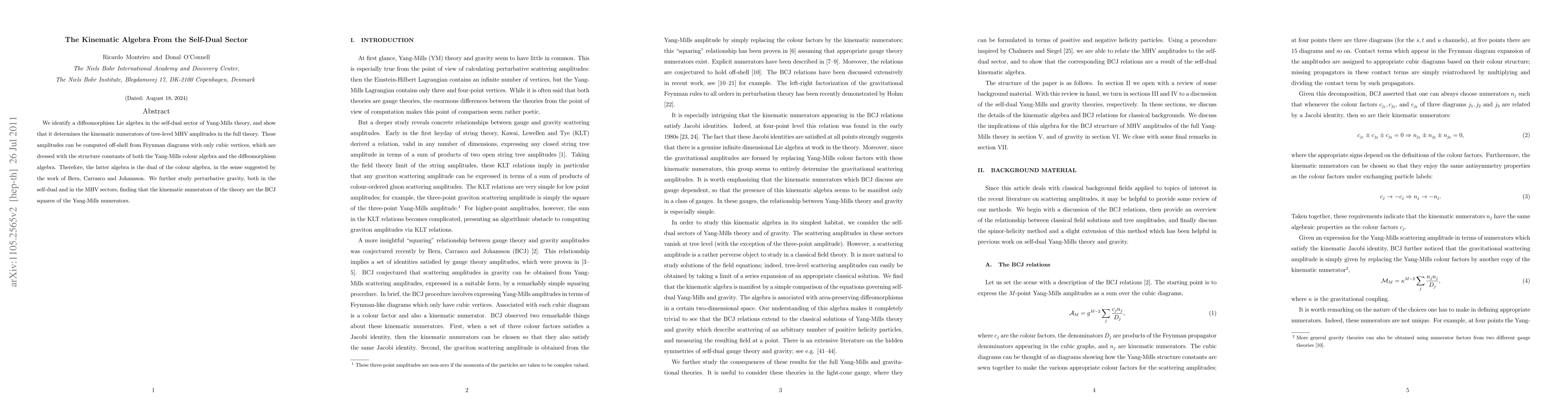 This paper identifies a diffeomorphism Lie algebra in Yang-Mills theory's self-dual sector, showing it determines the kinematic numerators for tree-level MHV amplitudes. The kinematic numerators of perturbative gravity are found to be BCJ squares of Yang-Mills numerators, establishing the diffeomorphism algebra as the dual of the colour algebra.