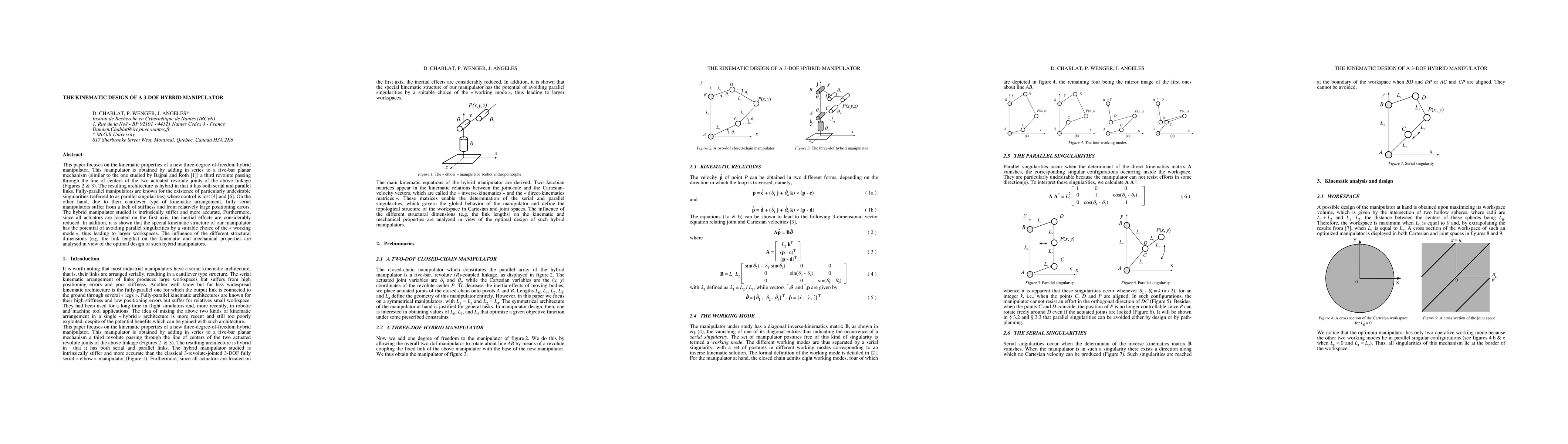 This paper focuses on the kinematic properties of a new three-degree-of-freedom hybrid manipulator. This manipulator is obtained by adding in series to a five-bar planar mechanism (similar to the one studied by Bajpai and Roth) a third revolute passing through the line of centers of the two actuated revolute joints of the above linkage. The resulting architecture is hybrid in that it has both serial and parallel links. Fully-parallel manipulators are known for the existence of particularly undesirable singularities (referred to as parallel singularities) where control is lost [4] and [6]. On the other hand, due to their cantilever type of kinematic arrangement, fully serial manipulators suffer from a lack of stiffness and from relatively large positioning errors. The hybrid manipulator studied is intrinsically stiffer and more accurate. Furthermore, since all actuators are located on the first axis, the inertial effects are considerably reduced. In addition, it is shown that the special kinematic structure of our manipulator has the potential of avoiding parallel singularities by a suitable choice of the "working mode", thus leading to larger workspaces. The influence of the different structural dimensions (e.g. the link lengths) on the kinematic and mechanical properties are analysed in view of the optimal design of such hybrid manipulators.