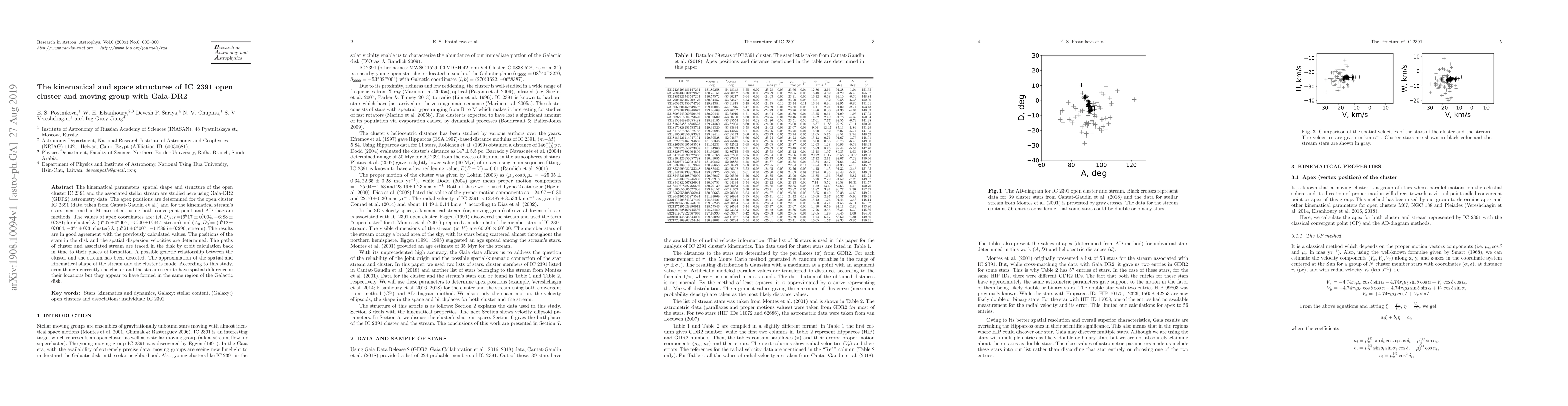 The kinematical parameters, spatial shape and structure of the open cluster IC 2391 and the associated stellar stream are studied here using Gaia-DR2 (GDR2) astrometry data. The apex positions are determined for the open cluster IC 2391 (data taken from Cantat-Gaudin et al.) and for the kinematical streams stars mentioned in Montes et al. using both convergent point and AD-diagram methods. The values of apex coordinates identified. The results are in good agreement with the previously calculated values. The positions of the stars in the disk and the spatial dispersion velocities are determined. The paths of cluster and associated stream are traced in the disk by orbit calculation back in time to their places of formation. A possible genetic relationship between the cluster and the stream has been detected. The approximation of the spatial and kinematical shape of the stream and the cluster is made. According to this study, even though currently the cluster and the stream seem to have spatial difference in their locations but they appear to have formed in the same region of the Galactic disk.