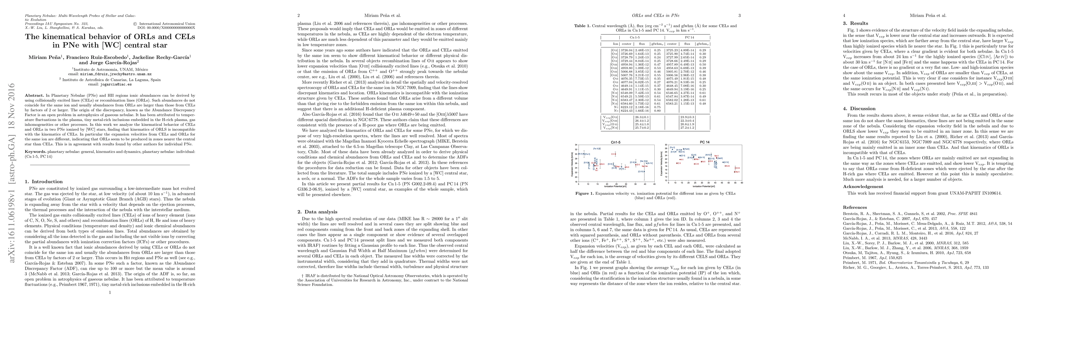 In Planetary Nebulae (PNe) and HII regions ionic abundances can be derived by using collisionally excited lines (CELs) or recombination lines (ORLs). Such abundances do not coincide for the same ion and usually abundances from ORLs are larger than those from CELs by factors of 2 or larger. The origin of the discrepancy, known as the Abundance Discrepancy Factor is an open problem in astrophysics of gaseous nebulae. It has been attributed to temperature fluctuations in the plasma, tiny metal-rich inclusions embedded in the H-rich plasma, gas inhomogeneities or other processes. In this work we analyze the kinematical behavior of CELs and ORLs in two PNe ionized by [WC] stars, finding that kinematics of ORLS is incompatible with the kinematics of CELs. In particular the expansion velocities from CELs and ORLs for the same ion are different, indicating that ORLs seem to be produced in zones nearer the central star than CELs. This is in agreement with results found by other authors for individual PNe.