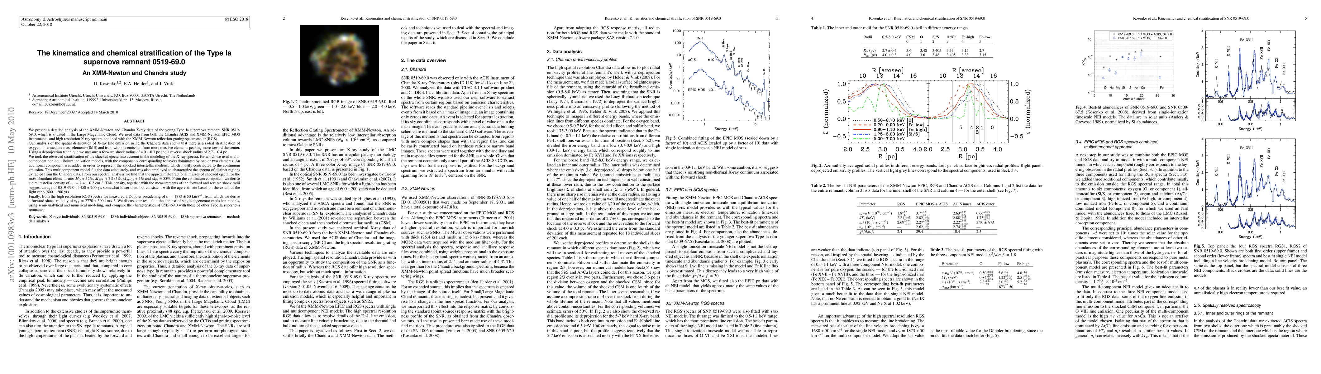 Researchers analyzed X-ray data from a Type Ia supernova remnant to study its kinematics and chemical stratification, finding that the shock front is composed of elements in layers with varying abundance.