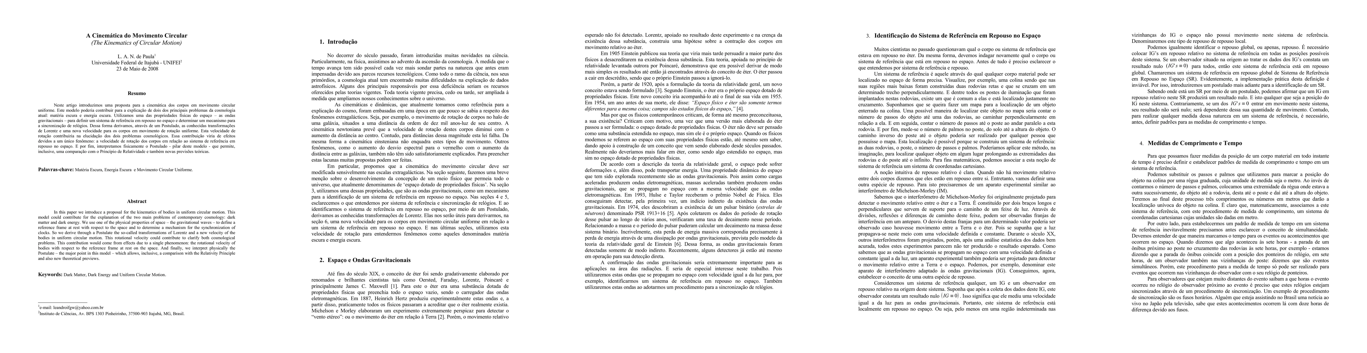 In this paper we introduce a proposal for the kinematics of bodies in uniform circular motion. This model could contribute for the explanation of the two main problems of contemporary cosmology: dark matter and dark energy. We use one of the physical properties of space - the gravitational waves - to define a reference frame at rest with respect to the space and to determine a mechanism for the synchronization of clocks. So we derive through a Postulate the so-called transformations of Lorentz and a new velocity of the bodies in uniform circular motion. This rotational velocity could contribute to clarify both cosmological problems. This contribution would come from effects due to a single phenomenon: the rotational velocity of bodies with respect to the reference frame at rest on the space. And finally, we interpret physically the Postulate - the major point in this model - which allows, inclusive, a comparison with the Relativity Principle and also new theoretical previews.
