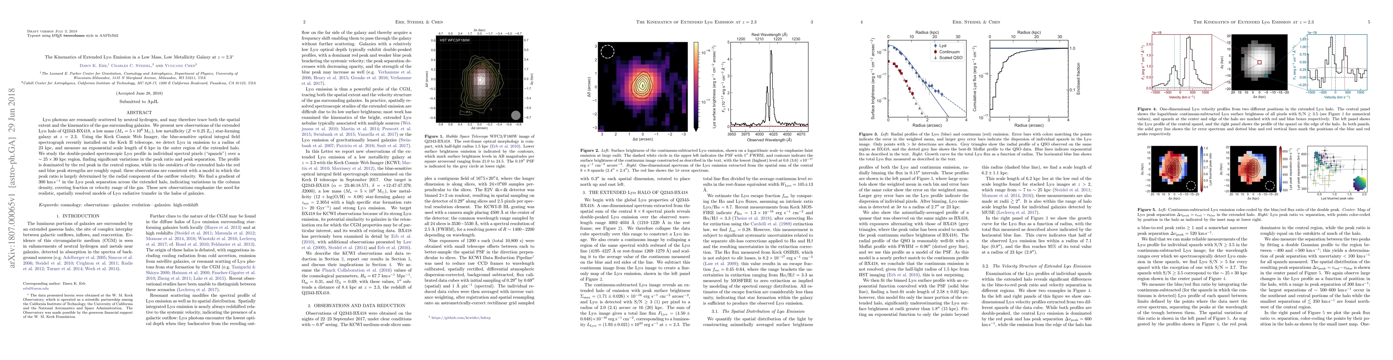 Researchers observed a low-mass galaxy at z = 2.3 with an extended Lyman-alpha halo, detecting emission to 23 kpc radius, and found a gradient of 300 km s$^{-1}$ in peak separation across the halo.