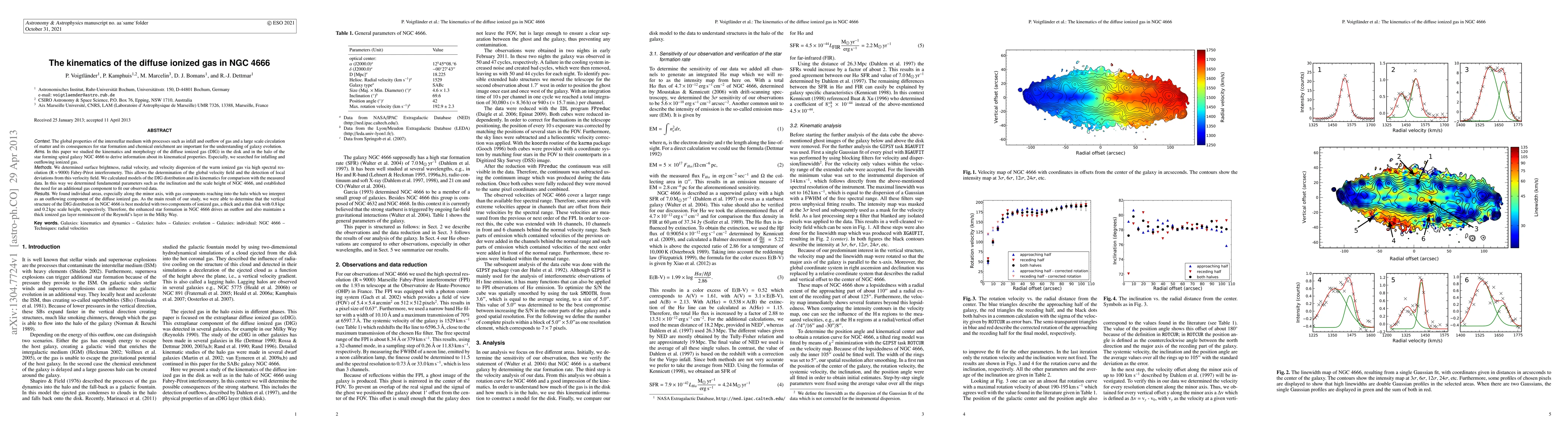 The global properties of the interstellar medium with processes such as infall and outflow of gas and a large scale circulation of matter and its consequences for star formation and chemical enrichment are important for the understanding of galaxy evolution. In this paper we studied the kinematics and morphology of the diffuse ionized gas (DIG) in the disk and in the halo of the star forming spiral galaxy NGC 4666 to derive information about its kinematical properties. Especially, we searched for infalling and outflowing ionized gas. We determined surface brightness, radial velocity, and velocity dispersion of the warm ionized gas via high spectral resolution (R ~ 9000) Fabry-P\'erot interferometry. This allows the determination of the global velocity field and the detection of local deviations from this verlocity field. We calculated models of the DIG distribution and its kinematics for comparison with the measured data. In this way we determined fundamental parameters such as the inclination and the scale height of NGC 4666, and established the need for an additional gas component to fit our observed data. We found individual areas, especially along the minor axis, with gas components reaching into the halo which we interpret as an outflowing component of the diffuse ionized gas. As the main result of our study, we were able to determine that the vertical structure of the DIG distribution in NGC 4666 is best modeled with two components of ionized gas, a thick and a thin disk with 0.8 kpc and 0.2 kpc scale height, respectively. Therefore, the enhanced star formation in NGC 4666 drives an outflow and also maintains a thick ionized gas layer reminiscent of the Reynold's layer in the Milky Way.