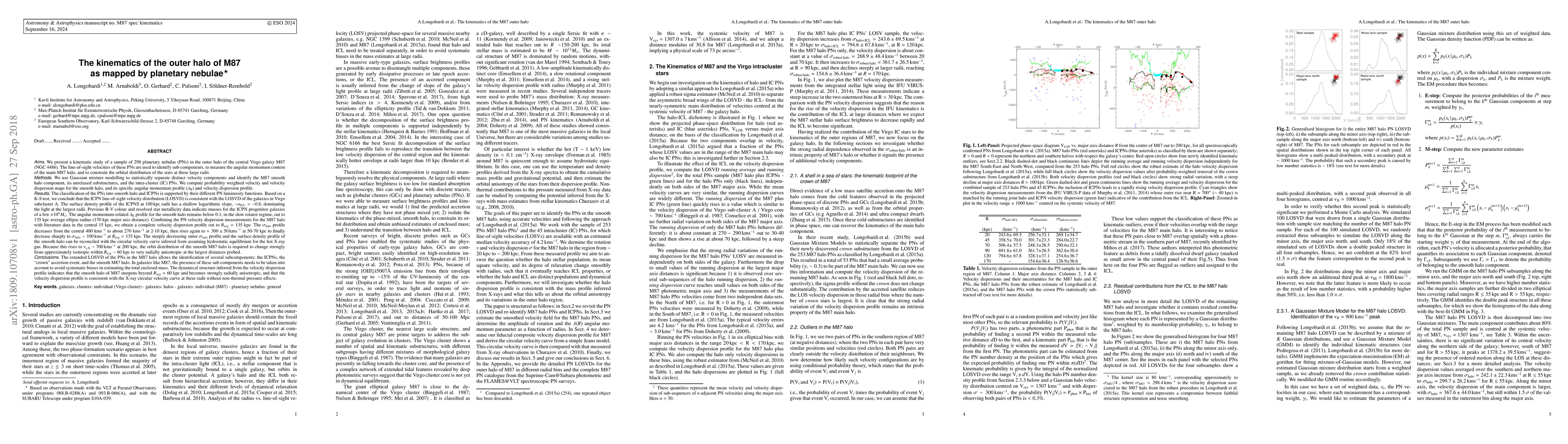 The study of 298 planetary nebulae in M87's outer halo reveals a shallow surface density profile (-0.8 at 100 kpc), a slow rotator halo with angular momentum content, and a sharp decrease in velocity dispersion to ~100 km/s at 135 kpc. The halo's orbit distribution changes from isotropic to radially anisotropic beyond 60 kpc, aligning with X-ray gas circular velocity curve, suggesting a complex dynamical structure in M87.