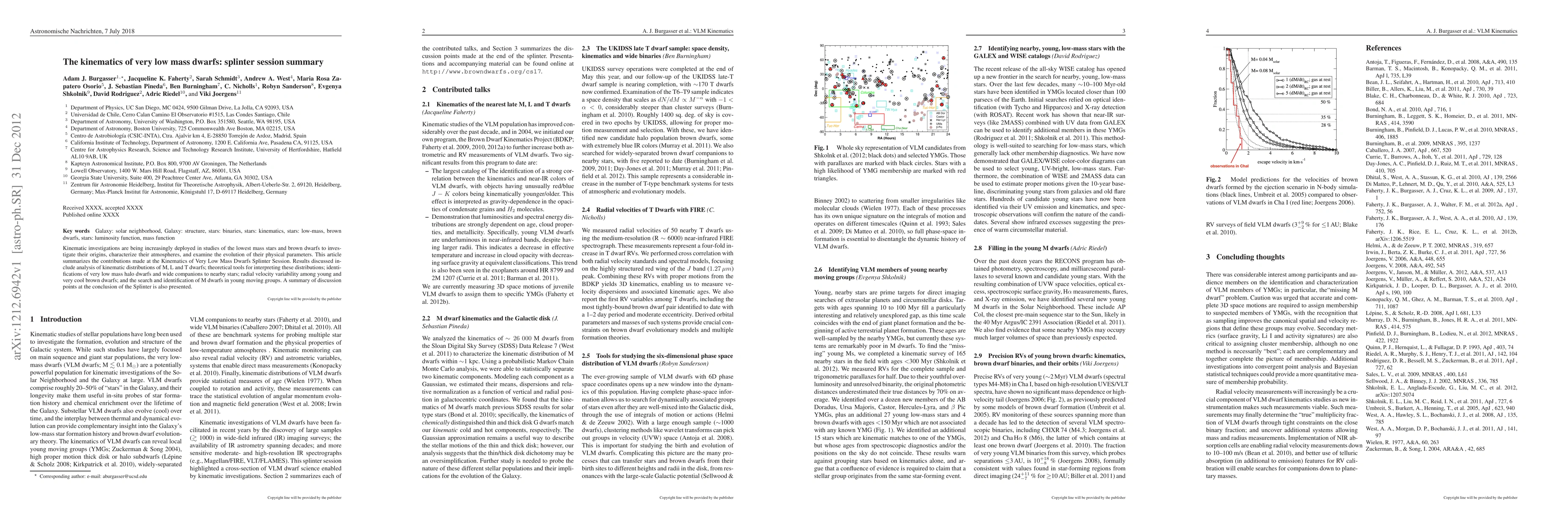 This paper summarizes findings from a session on the kinematics of very low mass dwarfs, including analyses of M, L, and T dwarf distributions, theoretical tools for interpretation, identifications of halo dwarfs and wide companions, radial velocity variability in young brown dwarfs, and the search for M dwarfs in young moving groups. Discussions also covered concluding points from the session.