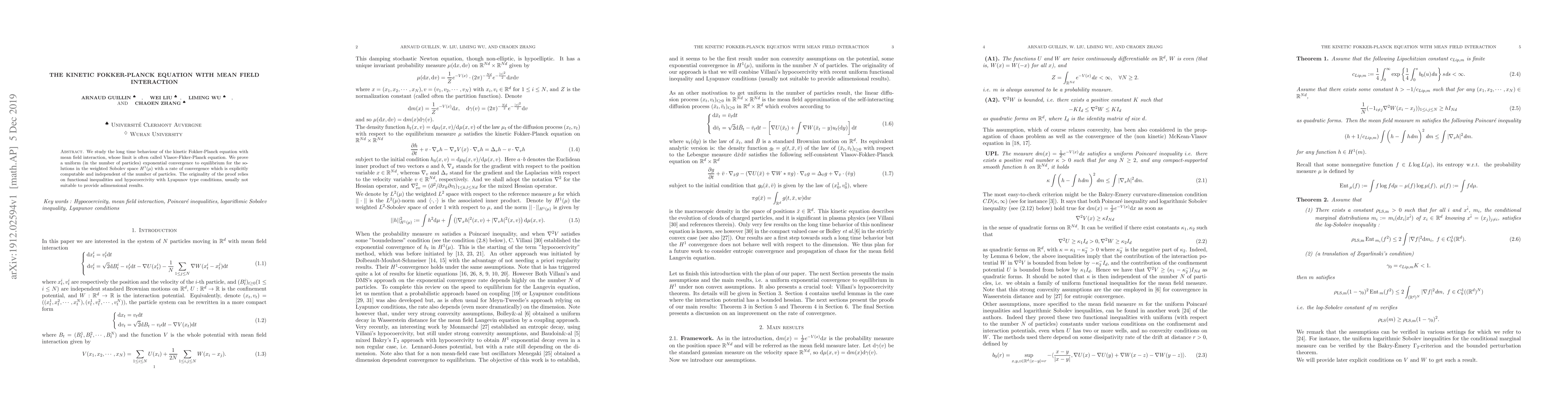 This paper investigates the long-term behavior of the kinetic Fokker-Planck equation with mean field interaction, proving exponential convergence to equilibrium in a weighted Sobolev space. The convergence rate is explicitly computable and independent of the number of particles, utilizing functional inequalities and hypocoercivity.