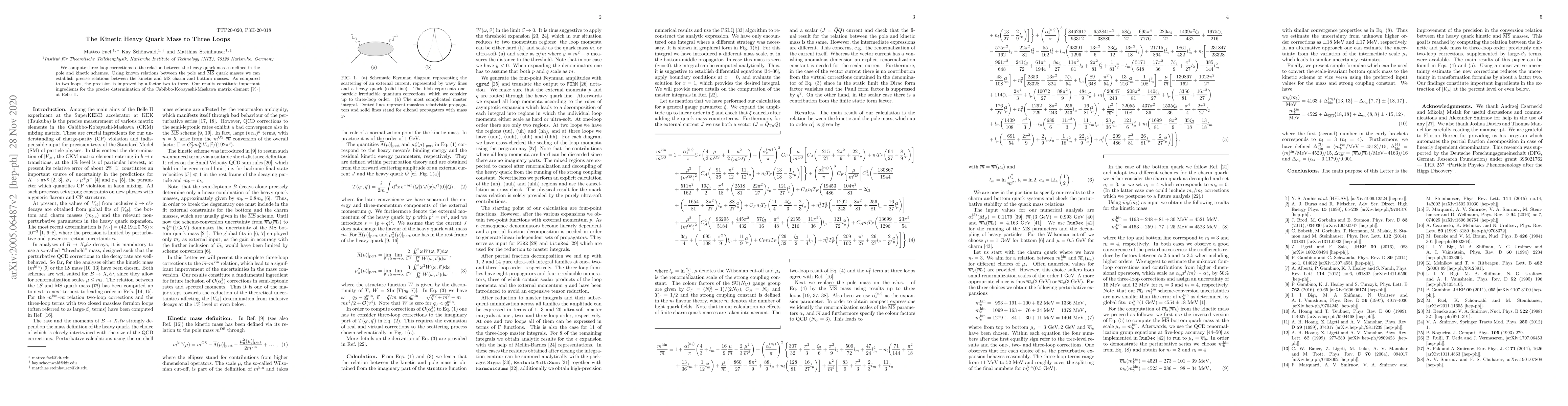 This paper computes three-loop corrections to the heavy quark mass relation between the pole and kinetic schemes, improving precision by a factor of two to three compared to two-loop results. These refined relations are crucial for determining the Cabibbo-Kobayashi-Maskawa matrix element $|V_{cb}|$ with greater accuracy at Belle II.