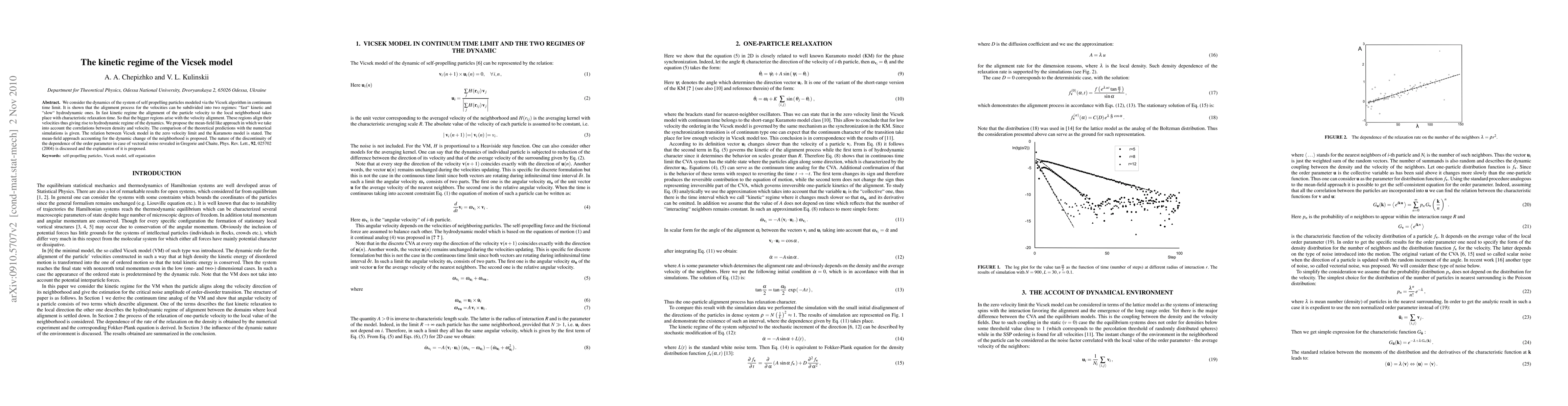 This paper investigates the dynamics of the Vicsek model, identifying two kinetic regimes: a fast regime where particle velocities align with local neighborhoods, and a slow hydrodynamic regime. Theoretical predictions using a mean-field approach are compared with numerical simulations, and connections to the Kuramoto model are explored.
