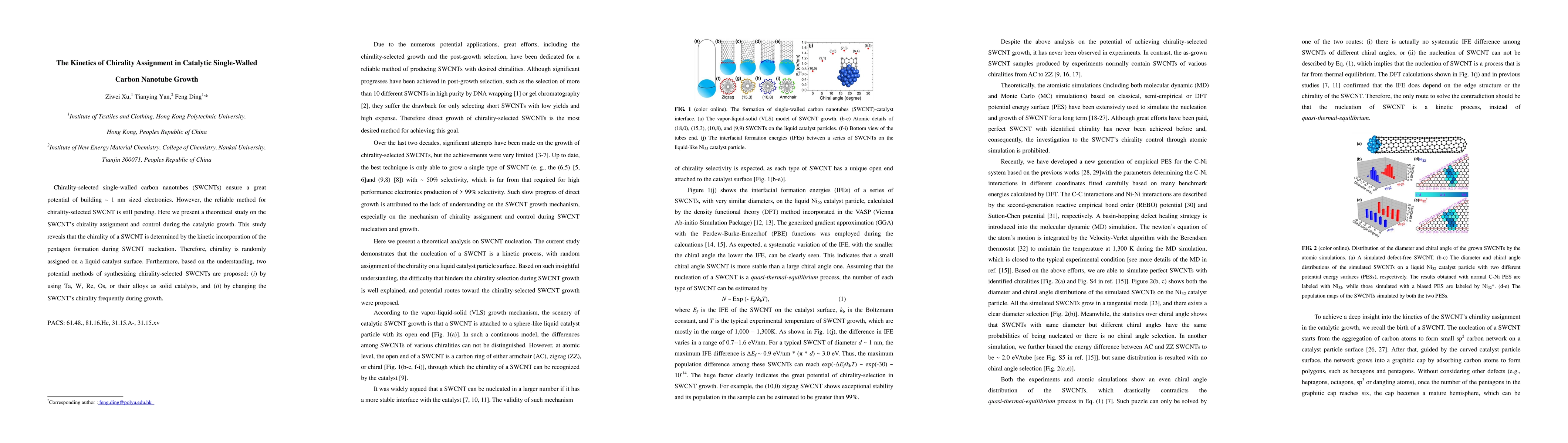 This paper investigates the kinetics of chirality assignment during the catalytic growth of single-walled carbon nanotubes (SWCNTs), revealing that chirality is determined by the random kinetic incorporation of pentagons during nucleation. Two proposed methods for synthesizing chirality-selected SWCNTs include using specific solid catalysts and altering chirality during growth.