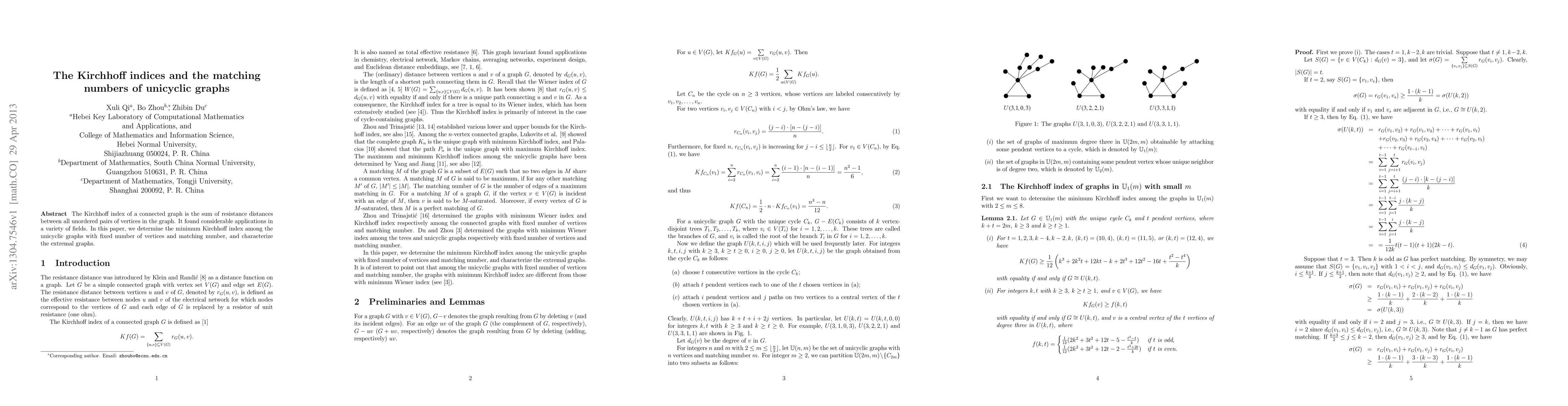 This paper investigates the Kirchhoff index for unicyclic graphs—graphs containing exactly one cycle—and explores the relationship between this index and the matching number. It identifies the unicyclic graphs with the minimum Kirchhoff index for a given number of vertices and matching number, and characterizes the graphs that achieve this minimum.