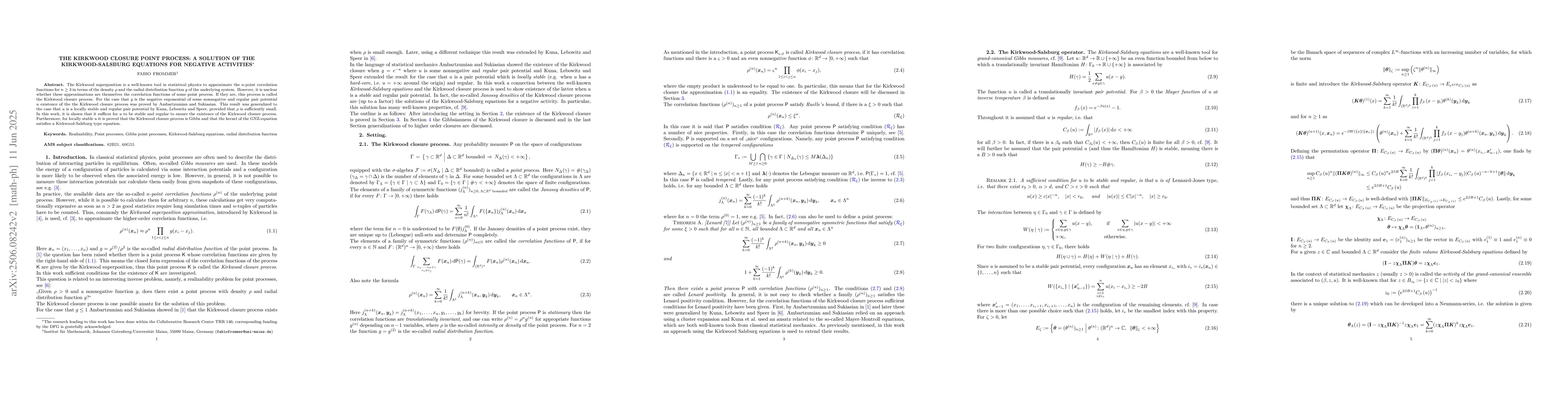 This research demonstrates that the Kirkwood closure process, an approximation method for correlation functions in statistical physics, exists under broad conditions related to particle interactions. It also shows that this process is a Gibbs measure and satisfies specific integral equations, deepening understanding of particle systems with stable and regular interactions.