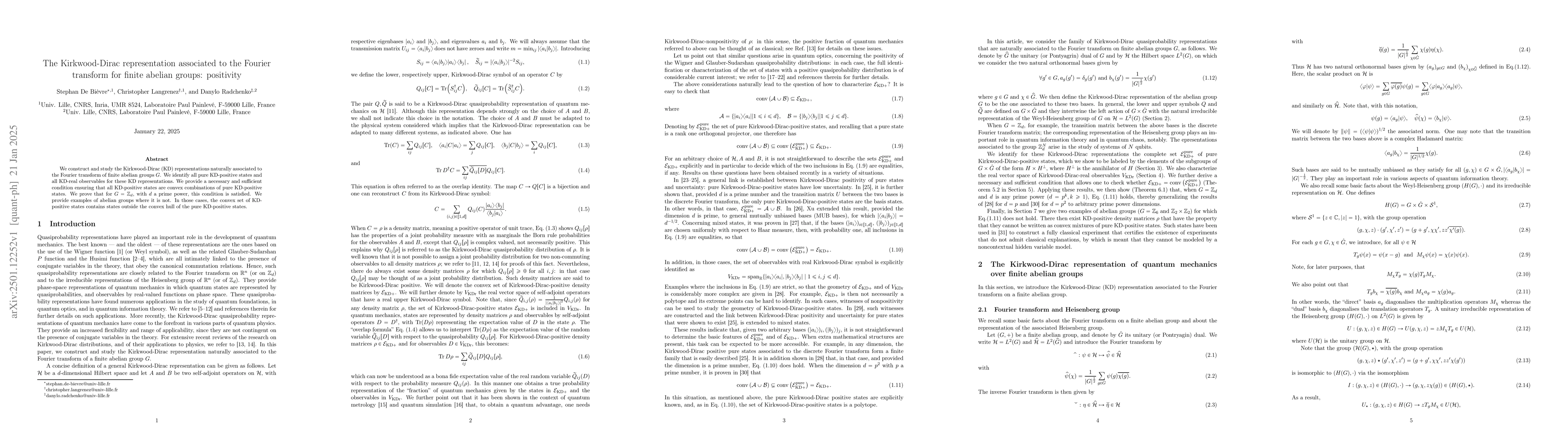 This paper constructs and analyzes Kirkwood-Dirac representations linked to the Fourier transform of finite abelian groups, identifying pure positive states and real observables. It establishes a condition for the convexity of all positive states as convex combinations of pure ones, which holds for $\mathbb{Z}_d$ where $d$ is a prime power but fails for other abelian groups.